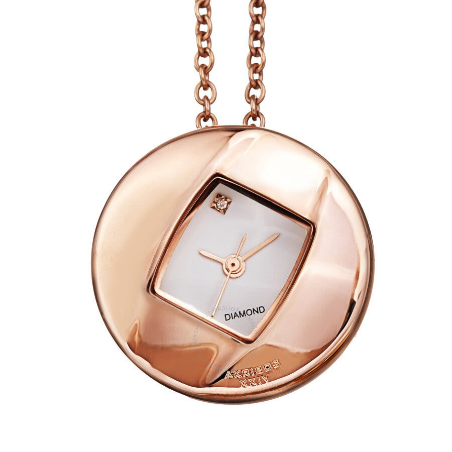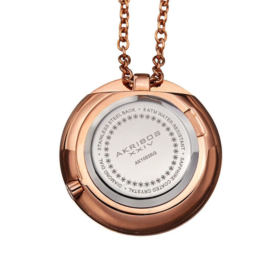 Rose gold-tone composite metal case with a rose gold-tone alloy chain. Fixed rose gold-tone bezel. White dial with rose gold-tone hands. Diamond set at the 12 o'clock position. Dial Type: Analog. Quartz movement. Scratch resistant mineral crystal. Pull / push crown. Solid case back. Round case shape. Case size: 28 mm. Case thickness: 9 mm. Chain length: 31 inches. Water resistant at 30 meters / 100 feet. Functions: hour, minute, second. Fashion watch style. Akribos XXIV Diamond White Dial Ladies Watch AK1053RG.
