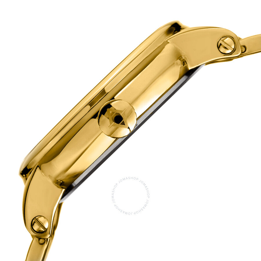 Yellow gold-tone composite metal case with a yellow gold-tone stainless steel bracelet. Fixed yellow gold-tone composite metal bezel. Black guilloche dial with yellow gold-tone Breguet-style hands and Roman numeral hour markers. Minute markers around the outer rim. Dial Type: Analog. Three displays showing: retrograde date, retrograde day of the week and 24 hour. Quartz movement. Scratch resistant mineral crystal. Pumpkin style pull / push crown. Solid case back. Round case shape. Case size: 46 mm. Case thickness: 12.5 mm. Band width: 22 mm. Band length: 8 inches. Butterfly clasp. Water resistant at 30 meters / 100 feet. Functions: date, day, hour, minute, second, retrograde. Fashion watch style. Akribos XXIV Quartz Black Dial Men's Watch AK1001YGB.