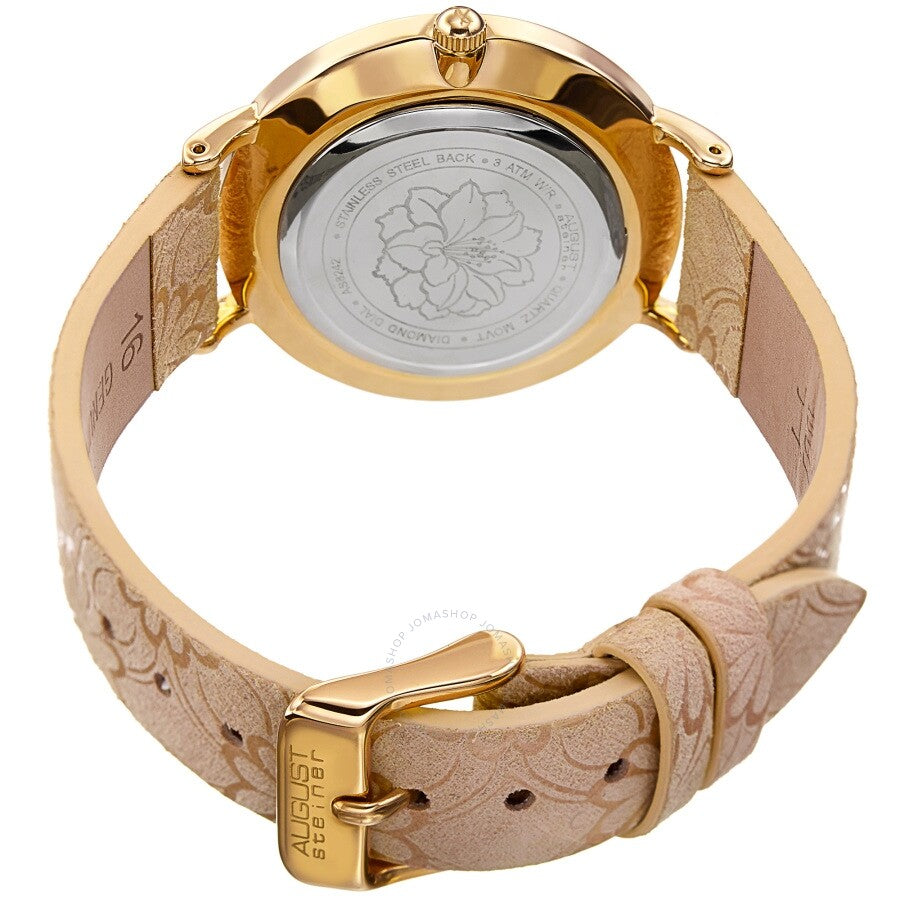 Gold-tone composite metal case with a beige (floral embossed) leather strap. Fixed gold-tone composite metal bezel. Silver (flower print) dial with gold-tone leaf-style hands and diamond hour markers. Dial Type: Analog. Quartz movement. Scratch resistant mineral crystal. Pull / push crown. Solid case back. Round case shape. Case size: 36 mm. Case thickness: 7 mm. Band width: 16 mm. Band length: 7 inches. Tang clasp. Water resistant at 30 meters / 100 feet. Functions: hour, minute. Fashion watch style. August Steiner Diamond Silver Dial Ladies Watch AS8242CM.