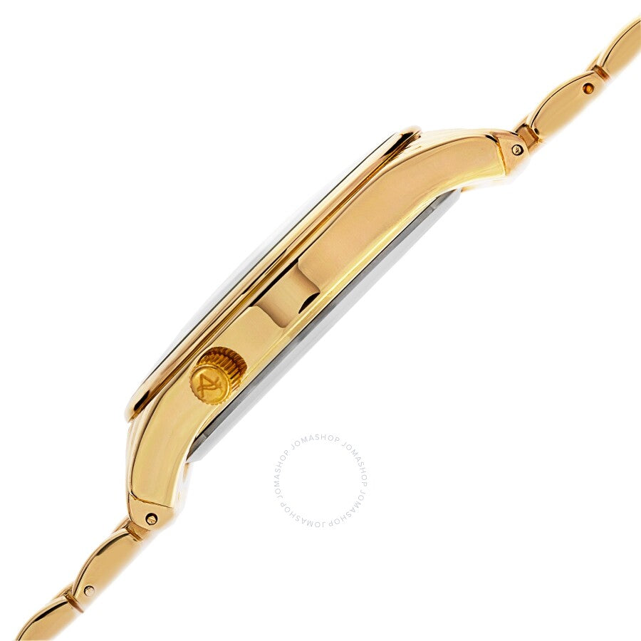 Gold-tone composite metal case with a gold-tone alloy bracelet. Fixed gold-tone composite metal bezel. Brown dial with gold-tone alpha-style shape hands and index hour markers. Minute markers around the outer rim. Dial Type: Analog. Two displays showing: small second and 12 hours. Quartz movement. Scratch resistant mineral crystal. Pull / push crown. Solid case back. Round case shape. Case size: 42 mm. Case thickness: 11 mm. Band width: 20 mm. Band length: 8.5 inches. Fold over clasp. Water resistant at 10 meters / 33 feet. Functions: second time zone, hour, minute, second. Travel watch style. August Steiner Quartz Brown Dial Men's Watch AS8141BR.