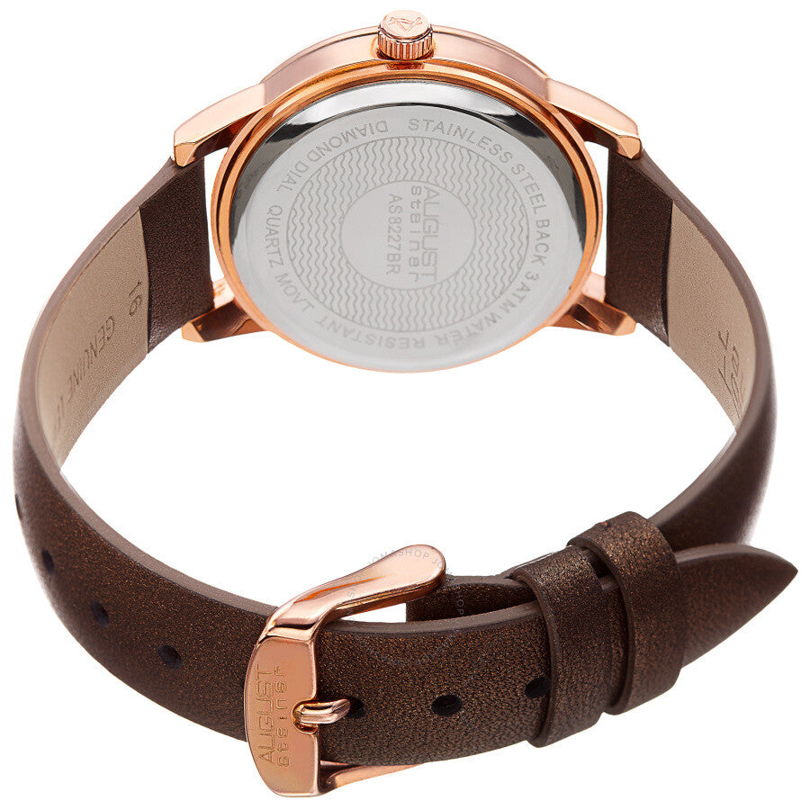 Gold-tone composite metal case with a brown leather strap. Fixed gold-tone composite metal bezel set with crystals. White dial with gold-tone alpha-style hands and index hour markers. Diamonds set at the 3, 6 and 9 o'clock position. An Arabic numeral appears at the 12 o'clock position. Minute markers around the outer rim. Dial Type: Analog. Quartz movement. Scratch resistant mineral crystal. Pull / push crown. Solid case back. Round case shape. Case size: 33 mm. Case thickness: 9 mm. Band width: 16 mm. Band length: 7 inches. Tang clasp. Water resistant at 30 meters / 100 feet. Functions: hour, minute. Fashion watch style. August Steiner Quartz Diamond White Dial Ladies Watch AS8227BR.