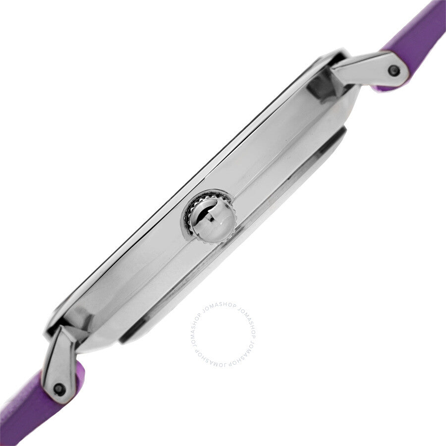 Silver-tone composite metal case with a purple leather strap. Fixed silver-tone composite metal bezel. White dial with silver-tone hands and index hour markers. Minute markers around the outer rim. Dial Type: Analog. Quartz movement. Scratch resistant mineral crystal. Pull / push crown. Solid case back. Round case shape. Case size: 35 mm. Case thickness: 7 mm. Band width: 14 mm. Band length: 7.5 inches. Tang clasp. Water resistant at 30 meters / 100 feet. Functions: hour, minute. Fashion watch style. Watch label: Japan Movt. August Steiner Quartz White Dial Ladies Watch AS8187PU.