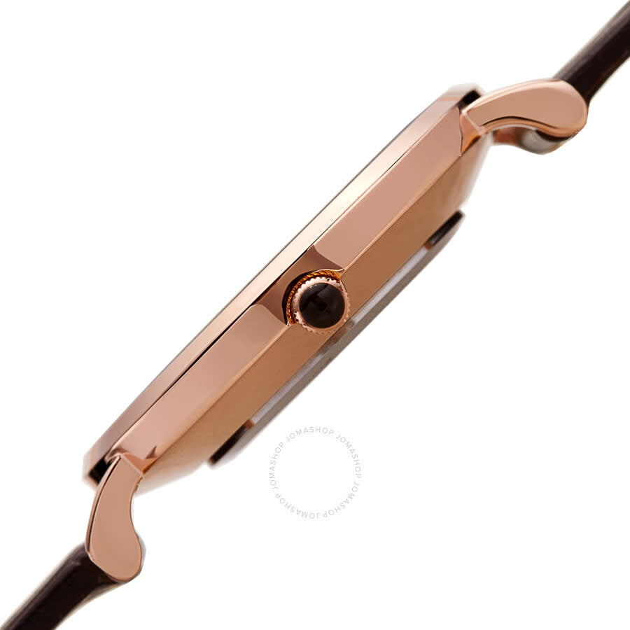Rose gold-tone composite metal case with a brown leather strap. Fixed rose gold-tone composite metal bezel. White dial with rose gold-tone hands and index hour markers. Dial Type: Analog. Quartz movement. Scratch resistant Hardlex crystal. Pull / push crown. Solid case back. Round case shape. Case size: 36 mm. Case thickness: 7.4 mm. Band width: 16 mm. Tang clasp. Water resistant at 30 meters / 100 feet. Functions: hour, minute. Casual watch style. Watch label: Made in China. August Steiner Quartz White Dial Ladies Watch AS8287BR.