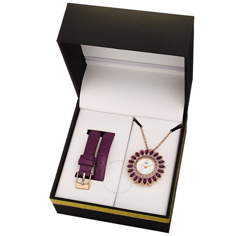 Rose gold-tone composite metal case with a purple leather strap. Fixed rose gold-tone composite metal bezel set with floral petal crystals. White dial with rose gold-tone hands. Diamond set at the 12 o'clock position. Dial Type: Analog. Quartz movement. Scratch resistant Hardlex crystal. Pull / push crown. Solid case back. Round case shape. Case size: 32 mm. Case thickness: 9 mm. Tang clasp. Water resistant at 30 meters / 100 feet. Functions: hour, minute, second. Dress watch style. Burgi Quartz Diamond White Dial Ladies Watch BUR273PU.