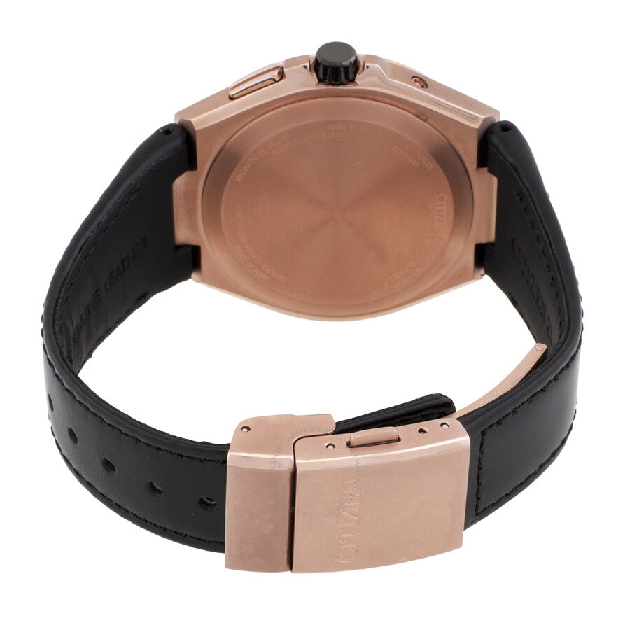 Rose gold IP titanium case with a black leather strap. Rose gold IP titanium bezel. Black dial with rose gold-tone hands and index hour markers. Minute markers around the outer rim. Dial Type: Analog. Date display at the 3 o'clock position. Date, signal reception indicator, summer time indicator subdials. Citizen Caliber Eco-Drive H145 solar quartz movement. Scratch resistant sapphire crystal. Solid case back. Round case shape, case size: 42.5 mm, case thickness: 10.1 mm. Deployment clasp. Water resistant at 100 meters / 330 feet. Functions: perpetual calendar, atomic timekeeping, radio controlled, world time, date, GMT, second time zone, hour, minute, second, solar-powered. Attesa Series. Sport watch style. Watch label: Japan Movt. Citizen Attesa Perpetual World Time Black Dial Men's Watch CB0217-04E.