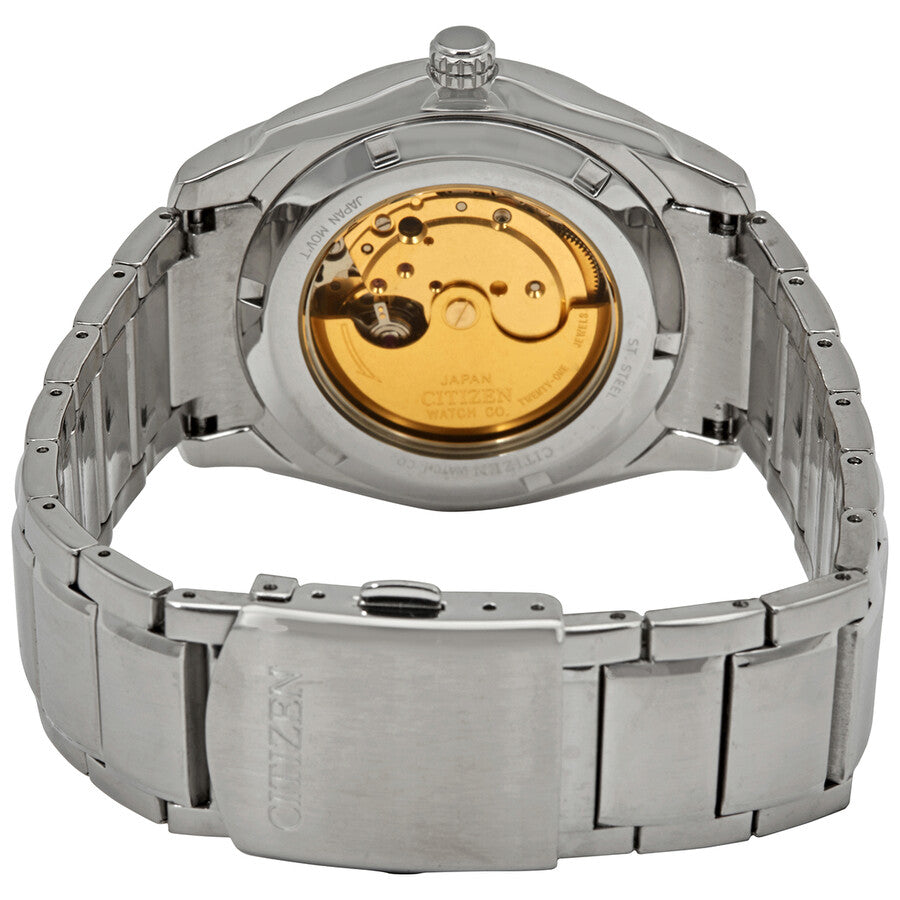 Stainless steel case with a stainless steel bracelet. Fixed stainless steel bezel. Black dial with luminous silver-tone hands and index hour markers. Arabic numerals mark the 6 and 12 o'clock positions. Minute markers around the outer rim. Dial Type: Analog. Luminescent hands and markers. Day of the week and date display at the 3 o'clock position. Citizen caliber 8200 automatic movement. Scratch resistant mineral crystal. Transparent case back. Round case shape. Case size: 42 mm. Case thickness: 12 mm. Band width: 22 mm. Fold over clasp. Water resistant at 100 meters / 330 feet. Functions: date, day, hour, minute, second. Casual watch style. Watch label: Japan Movt. Citizen Automatic Day-Date Black Dial Stainless Steel Men's Watch NH7490-55E.