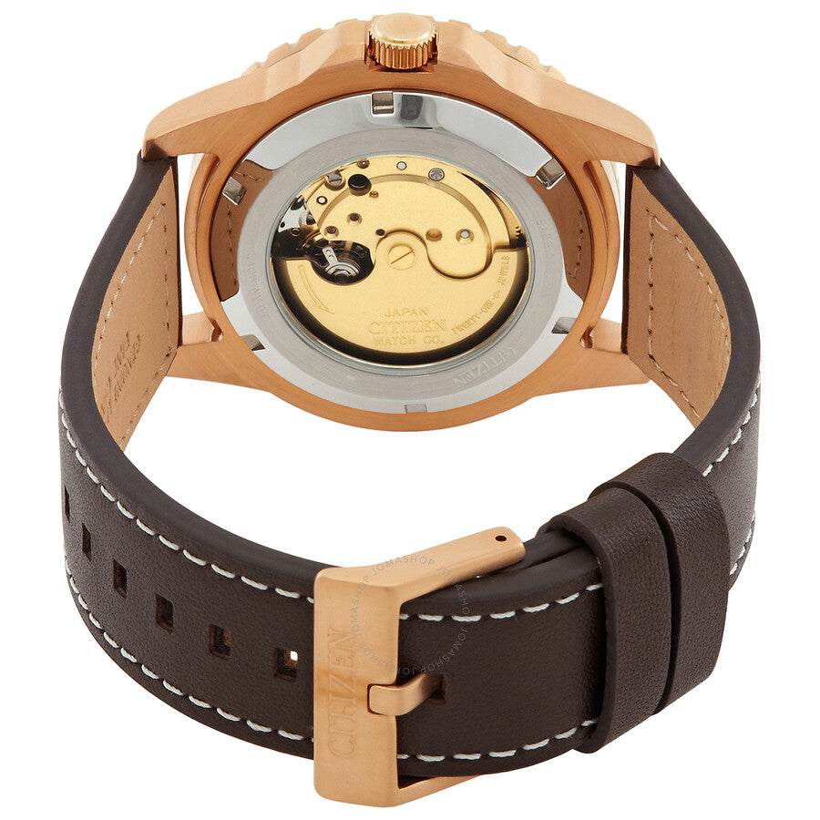 Rose gold-tone stainless steel case with a brown leather strap. Uni-directional rotating rose gold-tone stainless steel bezel with an inlaid green ring. Green dial with rose gold-tone hands and index hour markers. Minute markers around the outer rim. Dial Type: Analog. Date display at the 3 o'clock position. Citizen Caliber 8210 Automatic movement, containing 21 Jewels, bitting at 21600 vph, and has a power reserve of approximately 45 hours. Scratch resistant mineral crystal. Transparent case back. Round case shape, case size: 43 mm, case thickness: 12.4 mm. Tang clasp. Water resistant at 100 meters / 330 feet. Functions: date, hour, minute, second. Casual watch style. Watch label: Japan Movt. Citizen Automatic Green Dial Men's Watch NJ0173-18X.