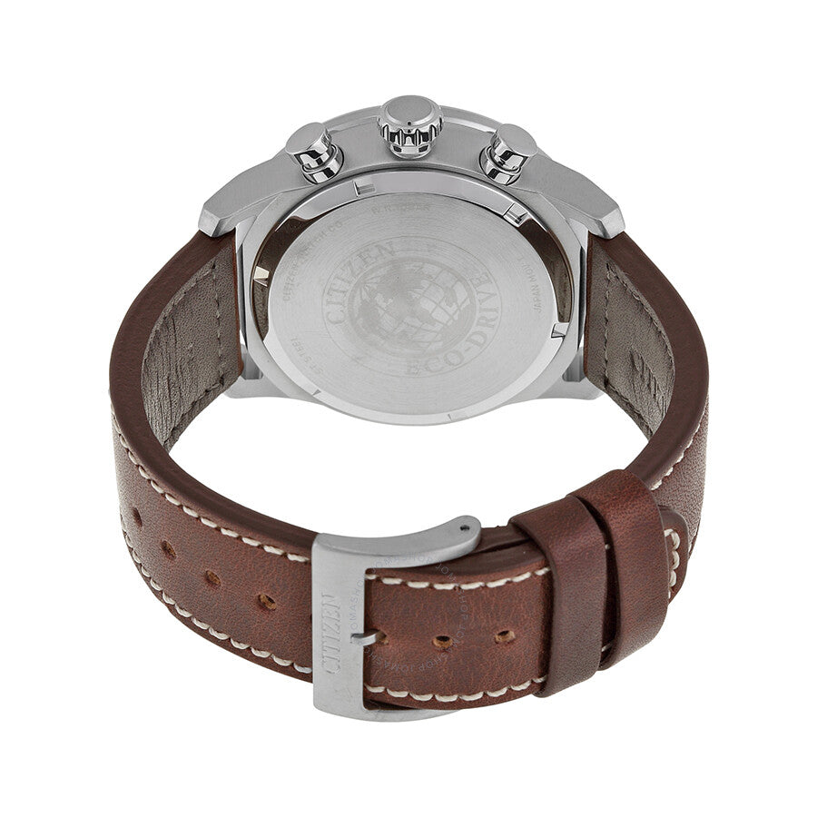Stainless steel case with a brown leather strap. Fixed stainless steel bezel. Black dial with luminous silver-tone hands and index / small Arabic numeral hour markers. Arabic numeral minute markers (at 5 minute intervals). Minute markers around the outer rim. Dial Type: Analog. Luminescent hands and markers. Date display between the 4 and 5 o'clock positions. Chronograph - three sub-dials displaying: 60 second, 60 minute and 24 hour. Citizen caliber Eco-Drive B620 eco-drive movement. Scratch resistant mineral crystal. Pull / push crown. Solid case back. Round case shape. Case size: 45 mm. Case thickness: 13.5 mm. Band width: 23 mm. Band length: 7.5 inches. Tang clasp. Water resistant at 200 meters / 660 feet. Functions: chronograph, hour, minute, second. Additional Info: in general, suitable for swimming and snorkeling, but not scuba diving. Casual watch style. Watch label: Japan Movt. Citizen Avion Eco-Drive Chronograph Black Dial Men's Watch CA4210-24E.