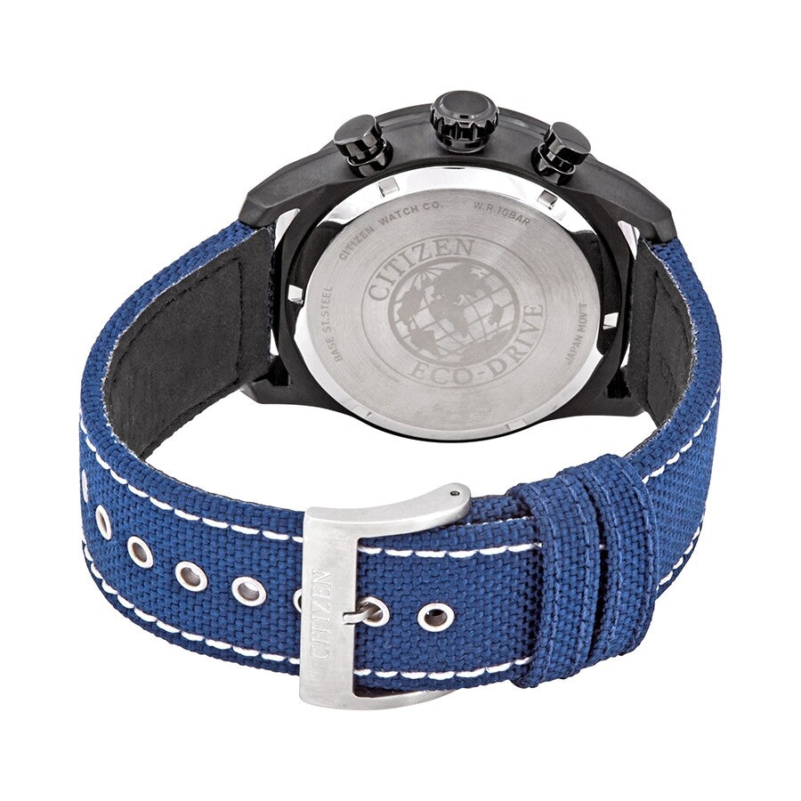 Black stainless steel case with a blue nylon strap. Fixed black stainless steel bezel. Black dial with blue-black hands and Arabic numeral hour markers. Minute markers around the outer rim. Dial Type: Analog. Date display between 4 and 5 o'clock position. Chronograph - three sub-dials displaying: 60 second, 60 minute and 24 hours. Citizen Caliber Eco-Drive B620 eco-drive movement. Scratch resistant mineral crystal. Solid case back. Round case shape. Case size: 45 mm. Water resistant at 100 meters / 330 feet. Functions: chronograph, date, hour, minute, second, solar-powered. Sport watch style. Watch label: Japan Movt. Citizen Black Dial Men's Chronograph Watch CA4215-39E.