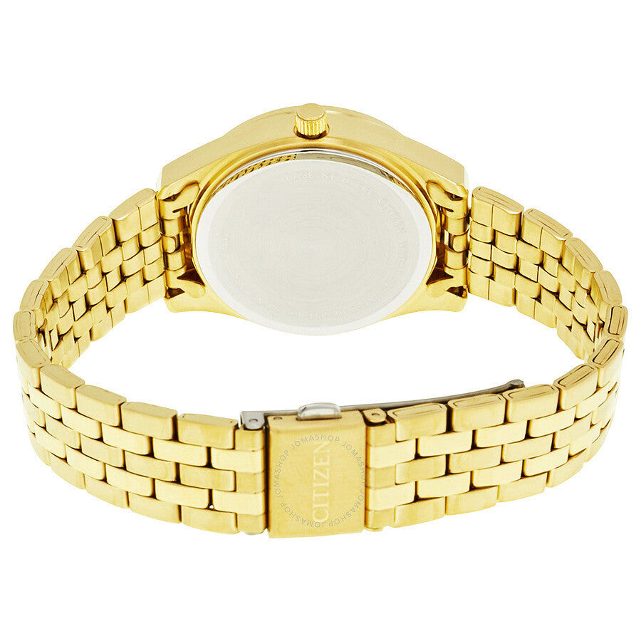 Gold-tone stainless steel case and bracelet. Fixed gold-tone bezel set with Swarovski crystals. Black dial with gold-tone hands and Arabic numeral hour markers. Minute markers around the outer rim. Dial Type: Analog. Date display at the 3 o'clock position. Three multi-function sub-dials displaying: date, day of the week and 24 hours. Quartz movement. Scratch resistant mineral crystal. Pull / push crown. Solid case back. Case size: 32 mm. Case thickness: 9 mm. Round case shape. Band width: 16 mm. Deployment clasp with a push button release. Water resistant at 30 meters / 100 feet. Functions: date, day, hour, minute, second. Casual watch style. Watch label: Japan Movt. Citizen Black Dial Multi-Function Ladies Watch ED8132-55E.