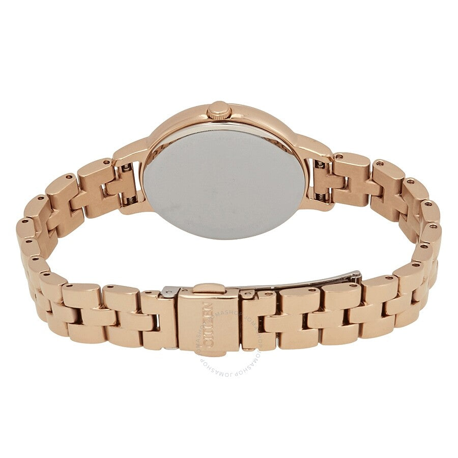 Rose gold-tone stainless steel case and bracelet. Fixed rose gold-tone bezel. Light brown dial with rose gold-tone hands and alternating index and Arabic numeral hour markers. Dial Type: Analog. Date display at the 3 o'clock position. Citizen caliber Eco-Drive E011 eco-drive movement. Scratch resistant spherical crystal crystal. Pull / push crown. Solid case back. Case size: 31 mm. Case thickness: 8 mm. Round case shape. Band width: 14 mm. Band length: 7 inches. Fold over clasp with a push button release. Water resistant at 50 meters / 165 feet. Functions: date, hour, minute, second. Casual watch style. Watch label: Japan Movt. Citizen Chandler Eco-Drive Light Brown Dial Ladies Watch EW2443-55X.