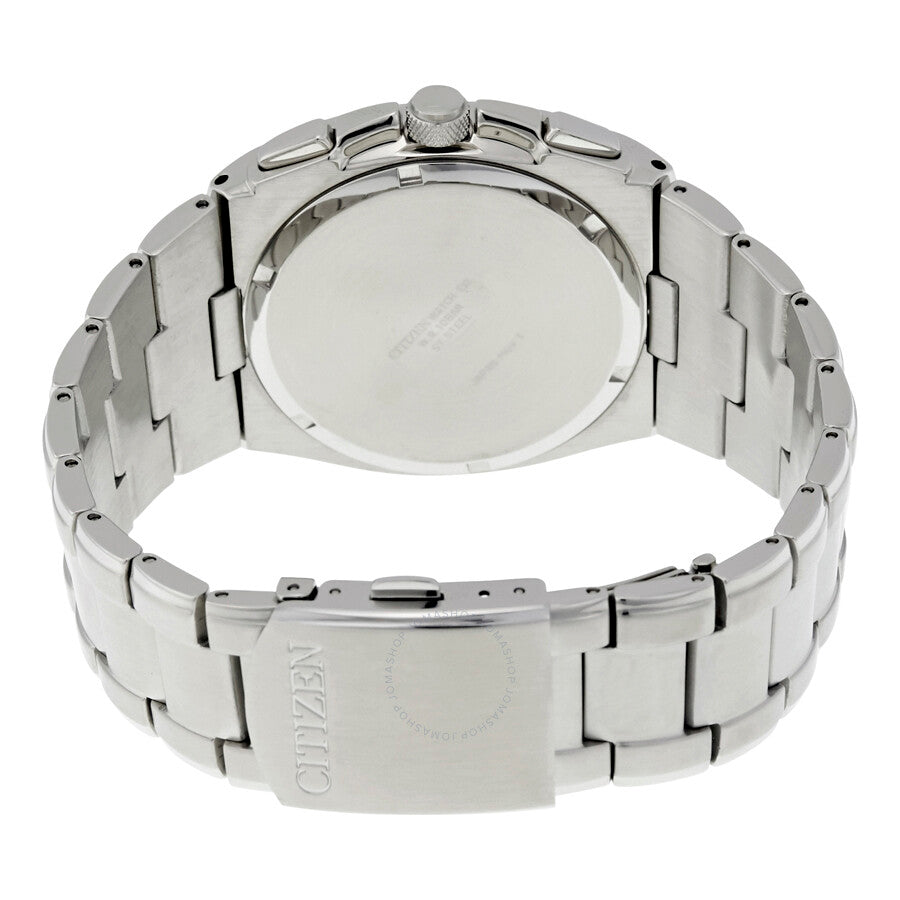 Stainless steel case with a stainless steel bracelet. Fixed stainless steel bezel. Blue dial with silver-tone hands and index hour markers. Minute markers. Dial Type: Analog. Luminescent hands. Date display between the 4 and 5 o'clock positions. Day of the week display. Chronograph - two sub-dials displaying: 60 second and 60 minute. Quartz movement. Scratch resistant mineral crystal. Pull / push crown. Solid case back. Case size: 42 mm. Case thickness: 13 mm. Cushion case shape. Band width: 20 mm. Band length: 7 inches. Fold over with safety release clasp. Water resistant at 100 meters / 330 feet. Functions: chronograph, date, day of the week hour, minute, second. Sport watch style. Citizen Chronograph Blue Dial Men's Watch AN9000-53M.