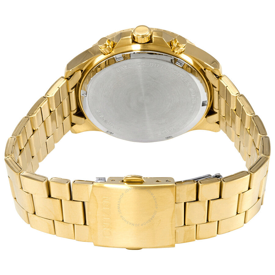 Gold-tone stainless steel case and bracelet. Fixrd gold-tone bezel. Black dial with luminous gold-tone hands and index hour markers. Arabic numeral appears at the 12 o'clock position. Minute markers. Tachymeter markings around the outer rim. Dial Type: Analog. Luminescent hands and markers. Date display between the 4 and 5 o'clock positions. Chronograph - sub-dials displaying: 24 hours, 60 minutes, 60 seconds. Citizen caliber 0520 quartz movement. Scratch resistant mineral crystal. Solid case back. Round case shape. Case size: 44 mm. Case thickness: 12 mm. Band width: 24 mm. Fold over clasp with a push button release. Water resistant at 100 meters / 330 feet. Functions: chronograph, date, hour, minute, second. Casual watch style. Citizen Chronograph Quartz Black Dial Men's Watch AN8122-51E.