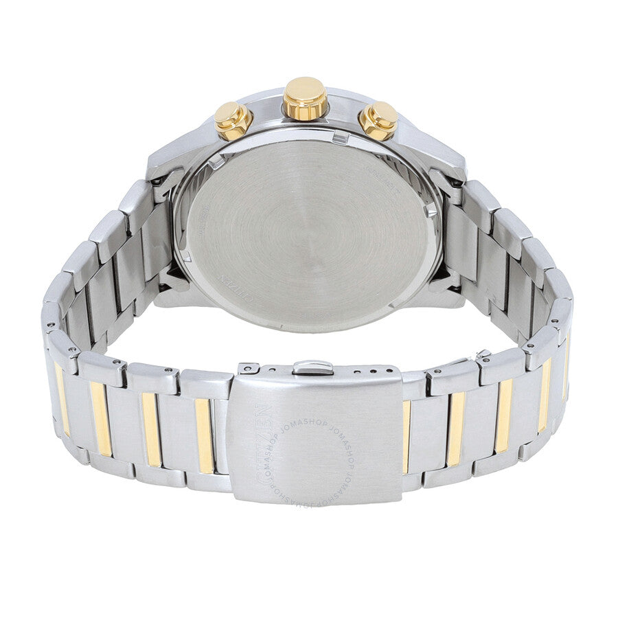 Stainless steel with gold plating stainless steel case with a two-tone (silver-tone and gold-tone) stainless steel bracelet. Fixed silver-tone stainless steel bezel with an inlaid blue ring. Blue dial with luminous gold-tone hands and index hour markers. Minute markers around the outer rim. Dial Type: Analog. Luminescent hands and markers. Date display at the 3 o'clock position. Chronograph - three sub-dials displaying: 60 second, 60 minute and 12 hour. Citizen Caliber 0510-C0A quartz movement. Scratch resistant mineral crystal. Solid case back. Round case shape, case size: 44 mm, case thickness: 12 mm. Band width: 23 mm. Fold over clasp with a safety release. Water resistant at 100 meters / 330 feet. Functions: chronograph, date, hour, minute, second. Casual watch style. Watch label: Japan Movt. Citizen Chronograph Quartz Blue Dial Men's Watch AN3684-59L.