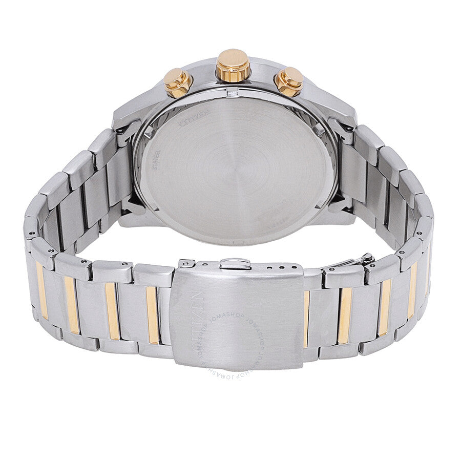 Silver-tone stainless steel with gold platingl case with a two-tone (silver-tone and gold-tone) stainless steel bracelet. Fixed silver-tone stainless steel with an inlaid green ring bezel. Green dial with luminous gold-tone hands and index hour markers. Tachymeter scale around the outer rim. Dial Type: Analog. Luminescent hands and markers. Date display at the 3 o'clock position. Chronograph - three sub-dials displaying: 60 second, 60 minute and 12 hour. Citizen Caliber 0510-C0A quartz movement. Scratch resistant mineral crystal. Solid case back. Round case shape, case size: 44 mm. Fold over clasp with a safety release. Water resistant at 100 meters / 330 feet. Functions: chronograph, date, hour, minute, second. Casual watch style. Watch label: Japan Movt. Citizen Chronograph Quartz Green Dial Men's Watch AN3689-55X.