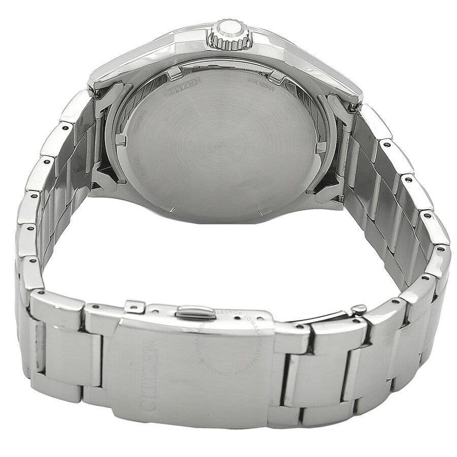Silver-tone stainless steel case and bracelet. Fixed silver-tone stainless steel bezel. Black dial with silver-tone hands and index hour markers. Minute markers around the outer rim. Dial Type: Analog. Date display at the 6 o'clock position. Citizen Caliber Eco-Drive J810 eco-drive movement. Scratch resistant mineral crystal. Pull / push crown. Solid case back. Round case shape, case size: 41 mm. Fold over clasp with a safety release. Water resistant at 100 meters / 330 feet. Functions: date, hour, minute, second, solar-powered. Casual watch style. Watch label: Japan Movt. Citizen Eco-Drive Black Dial Men's Watch AW1750-85E.