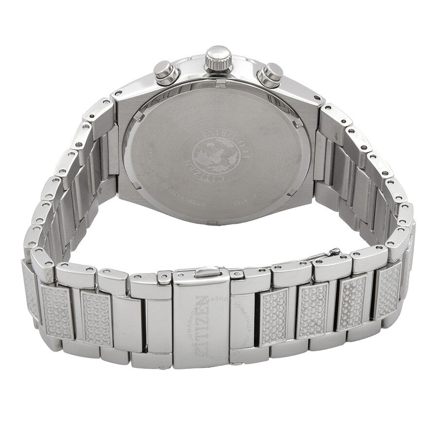 Silver-tone stainless steel case with a silver-tone stainless steel bracelet set with crystal accents. Fixed silver-tone bezel with crystal set. Black dial with silver-tone hands and crystal hour markers. Minute markers around the outer rim. Dial Type: Analog. Date display at the 3 o'clock position. Chronograph - three sub-dials displaying: 60 second, 60 minute and 24 hour. Citizen Caliber Eco-Drive B612 eco-drive movement. Scratch resistant mineral crystal. Pull / push crown. Solid case back. Round case shape, case size: 42 mm. Band width: 23 mm. Fold over clasp with a safety release. Water resistant at 50 meters / 165 feet. Functions: chronograph, date, hour, minute, second, solar-powered. Crystal Series. Sport watch style. Watch label: Japan Movt. Citizen Crystal Chronograph Eco-Drive Black Dial Men's Watch CA0750-53E.