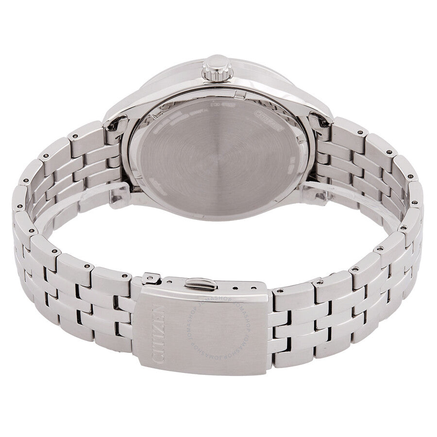 Silver-tone stainless steel case and bracelet. Fixed silver-tone stainless steel bezel. Blue dial with silver-tone hands and index hour markers. Minute markers around the outer rim. Dial Type: Analog. Date display at the 3 o'clock position. Citizen Caliber Eco-Drive E111 eco-drive movement. Scratch resistant sapphire crystal. Pull / push crown. Solid case back. Round case shape, case size: 41 mm, case thickness: 9.8 mm. Fold over clasp with a safety release. Water resistant at 100 meters / 330 feet. Functions: date, hour, minute, second, solar-powered. Casual watch style. Watch label: Japan Movt. Citizen Eco-Drive Blue Dial Men's Watch BM7560-59L.
