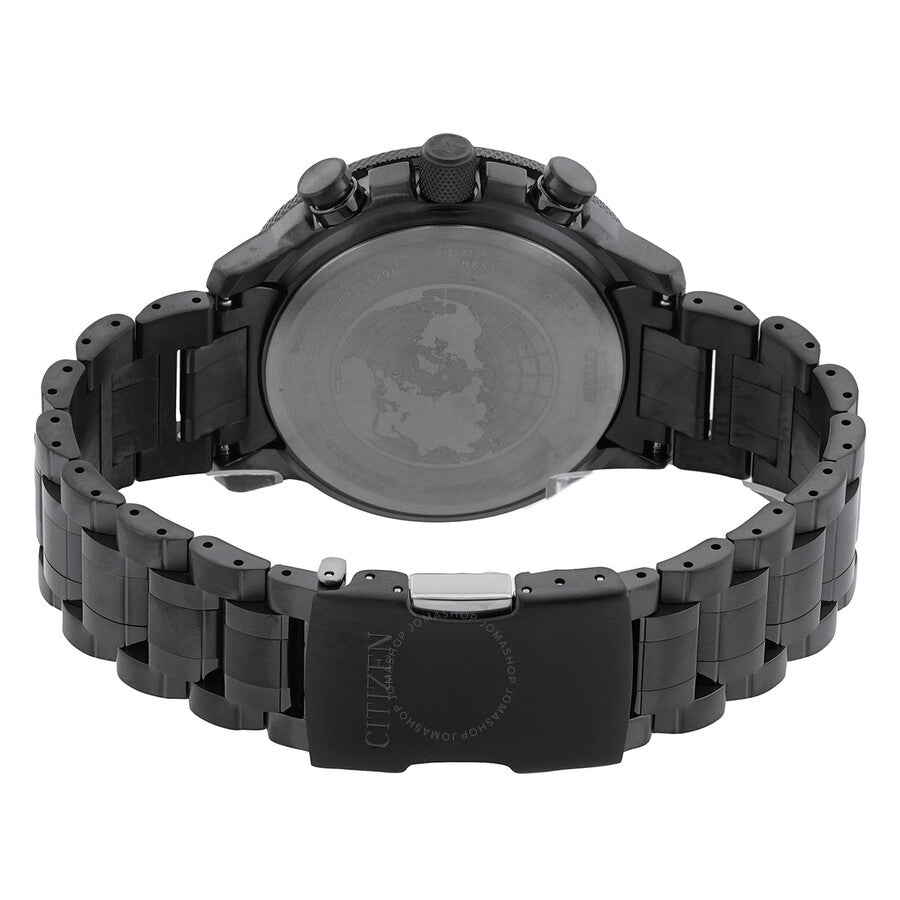 Black stainless steel case and bracelet. Fixed black stainless steel bezel. Blue dial with luminous hands and index-Arabic numeral hour markers. Minute markers around the outer rim. Dial Type: Analog. Luminescent hands and markers. Date display at the 4 o'clock position. Three-am-pm/24 hour,world time and day subdials. Citizen Caliber H864 eco-drive movement. Scratch resistant sapphire crystal. Solid case back. Round case shape, case size: 46 mm. Fold over clasp with a safety release. Water resistant at 200 meters / 660 feet. Functions: date, hour, minute, second,power reserve indication,antimagnetic,world time,. Promaster Series. Sport watch style. Watch label: Japan Movt. Citizen Promaster World Time Blue Dial Men's Watch BY3005-56E.
