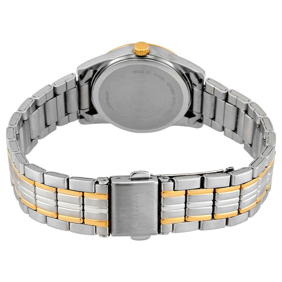 Stainless steel case with a two tone (silver-tone and gold-tone) stainless steel bracelet. Fixed gold-tone bezel. Blue dial with luminous gold-tone hands and Arabic numeral hour markers. Minute markers around the outer rim. Dial Type: Analog. Luminescent hands. Date display at the 3 o'clock position. Quartz movement. Scratch resistant mineral crystal. Pull / push crown. Solid case back. Round case shape,. Case size: 27 mm. Case thickness: 8 mm. Band width: 15 mm. Fold over clasp with a safety release. Water resistant at 50 meters / 165 feet. Functions: date, hour, minute, second. Dress watch style. Watch label: Japan Movt. Citizen Quartz Blue Dial Two-tone Ladies Watch EU6004-56L.