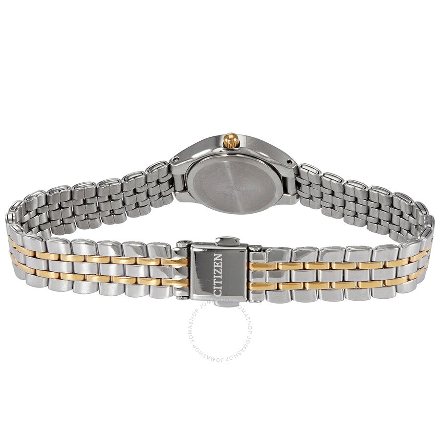 Stainless steel case with a two-tone (silver-tone and gold-tone) stainless steel bracelet. Fixed stainless steel bezel set with crystals. Black dial with gold-tone hands. Roman numerals appear at the 6 and 12 o'clock positions. Index markers at the 3 and 9 o'clock positions. Dial Type: Analog. Quartz movement. Scratch resistant mineral crystal. Pull / push crown. Solid case back. Round case shape. Case size: 21.4 mm. Case thickness: 11 mm. Band width: 11 mm. Fold over clasp with a push button release. Water resistant at 30 meters / 100 feet. Functions: hour, minute, second. Dress watch style. Citizen Quartz Crystal Black Dial Ladies Watch EJ6144-56E.