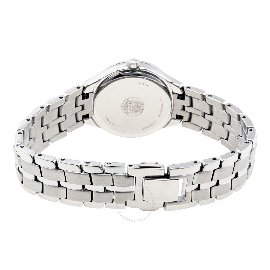 Stainless steel case with a stainless steel bracelet set with crystals. Fixed stainless steel bezel set with crystals. Black dial with silver-tone hands. Index markers at the 3, 6, 9 and 12 o'clock positions. Dial Type: Analog. Eco-drive movement. Scratch resistant mineral crystal. Pull / push crown. Solid case back. Case size: 28 mm. Case thickness: 9 mm. Round case shape. Band width: 15 mm. Deployment clasp with a push button release. Water resistant at 30 meters / 100 feet. Functions: hour, minute, second. Dress watch style. Item Variations: FE2060 53E, FE2060.53E, FE206053E. Citizen Silhouette Crystal Black Dial Stainless Steel Ladies Watch FE2060-53E.
