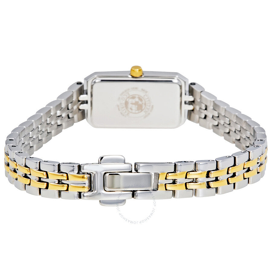 Stainless steel case with a two-tone (silver and gold-tone) stainless steel bracelet. Fixed bezel. Blue mother of pearl dial with gold-tone hands and index with r hour markers. Oman numerals mark the 12, 3, 6, 9 o'clock position. Dial Type: Analog. Eco-drive movement. Scratch resistant mineral crystal. Pull / push crown. Solid case back. Case size: 15 mm. Case thickness: 7 mm. Rectangle case shape. Band width: 10 mm. Deployment clasp with a push button release. Water resistant at 30 meters / 100 feet. Functions: hour, minute. Dress watch style. Watch label: Japan Movt. Item Variations: EG2694 59D, EG2694.59D, EG269459D. Citizen Silhouette Eco-Drive Blue MOP Dial Ladies Watch EG2694-59D.