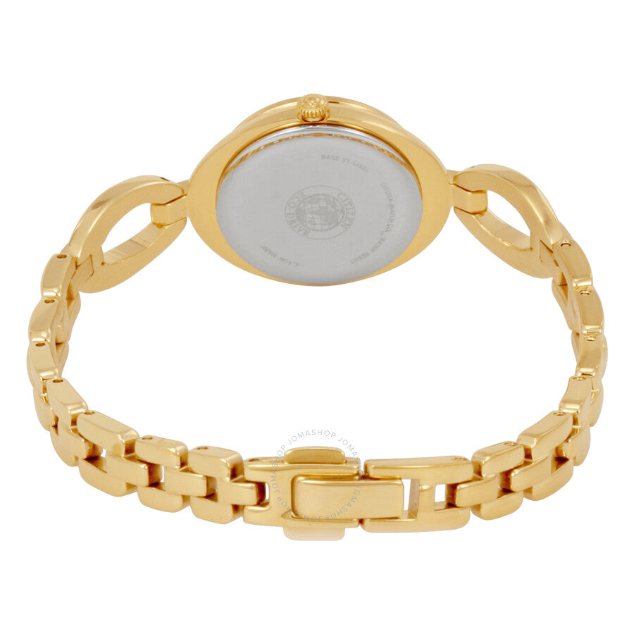 Gold-tone stainless steel case and bangle bracelet. Fixed gold-tone bezel. Mother of pearl dial with gold-tone hands and crystal and dot hour markers. Dial Type: Analog. Eco-Drive B023 quartz movement. Scratch resistant mineral crystal. Pull / push crown. Solid case back. Case size: 24 mm. Case thickness: 7.3 mm. Round case shape. Band width: 11 mm. Jewelry clasp. Water resistant at 30 meters / 100 feet. Functions: hour, minute. Additional Info: citizen eco-drive is powered by light, a watch that never needs a battery. Casual watch style. Citizen Silhouette Ladies Watch EX1432-51D.