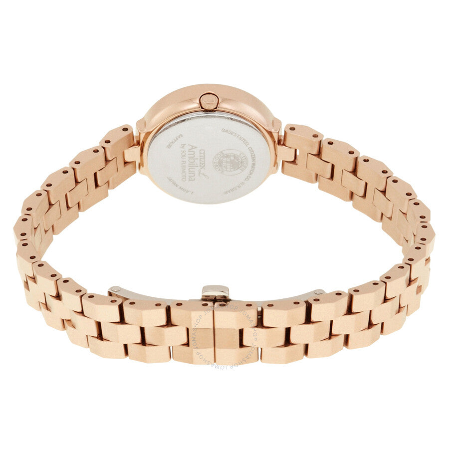 Rose gold-tone stainless steel case and bracelet. Fixed rose gold-tone bezel. Pink dial with rose gold-tone hands. No markers. Dial Type: Analog. Citizen caliber Eco-Drive B035 eco-drive movement. Scratch resistant sapphire crystal. Pull / push crown. Solid case back. Case size: 25 mm. Case thickness: 9 mm. Round case shape. Band width: 12 mm. Deployment clasp with a push button release. Water resistant at 50 meters / 165 feet. Functions: hour, minute, second. Dress watch style. Watch label: Japan Movt. Citizen Silhouette Pink Dial Ladies Watch EW5503-83X.