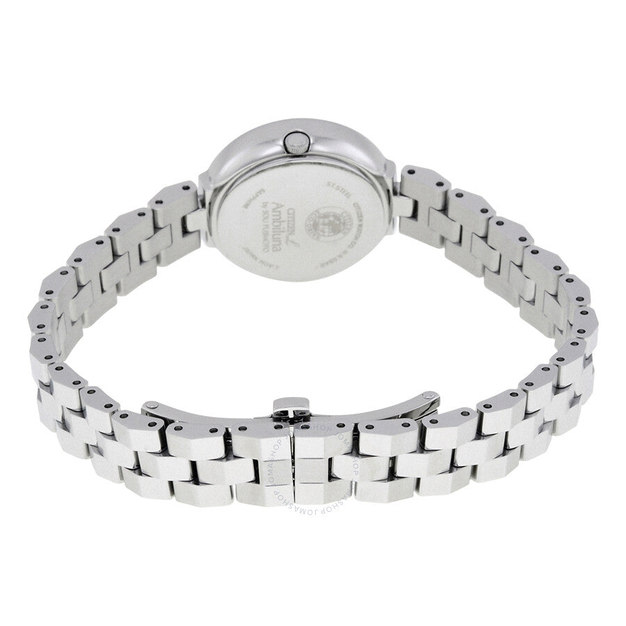 Stainless steel case with a stainless steel bracelet. Fixed stainless steel bezel. Silver dial with silver-tone hands. No markers. Dial Type: Analog. Citizen Caliber Eco-Drive B035 eco-drive movement. Scratch resistant sapphire crystal. Pull / push crown. Solid case back. Case size: 25 mm. Case thickness: 9 mm. Round case shape. Band width: 12 mm. Deployment clasp with a push button release. Water resistant at 50 meters / 165 feet. Functions: hour, minute, second. Additional Info: in general, suitable for short periods of recreational swimming, but not diving or snorkeling. Casual watch style. Watch label: Japan Movt. Citizen Silhouette Silver Dial Ladies Watch EW5500-81A.