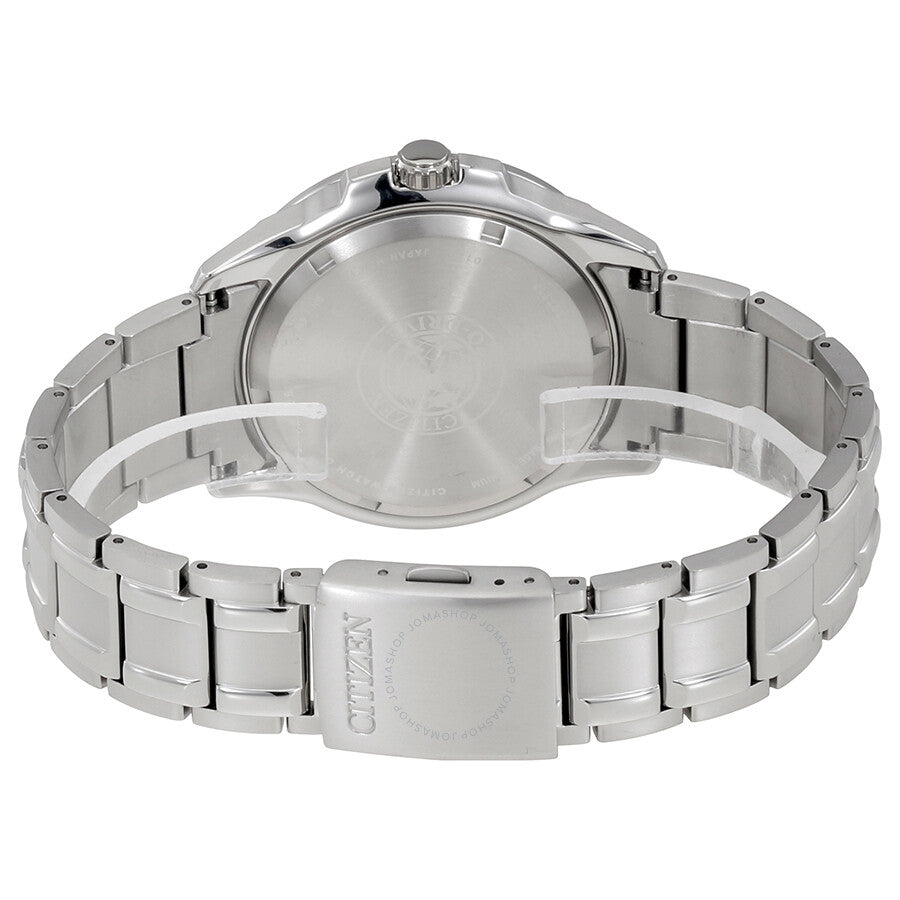 Titanium case with a titanium bracelet. Fixed titanium bezel with a blue top ring. Blue dial with luminous silver-tone hands and index hour markers. Arabic numerals mark the 3, 6, 9 and 12 o'clock positions. Minute markers around the outer rim. Dial Type: Analog. Date display at the 3 o'clock position. Citizen caliber Eco-Drive E111 eco-drive movement. Scratch resistant sapphire crystal. Pull / push crown. Solid case back. Case size: 42 mm. Case thickness: 10 mm. Round case shape. Band width: 22 mm. Fold over clasp with a push button release. Water resistant at 100 meters / 330 feet. Functions: date, hour, minute, second. Casual watch style. Watch label: Japan Movt. Citizen Ti+IP Blue Dial Titanium Men's Watch BM6929-56L.