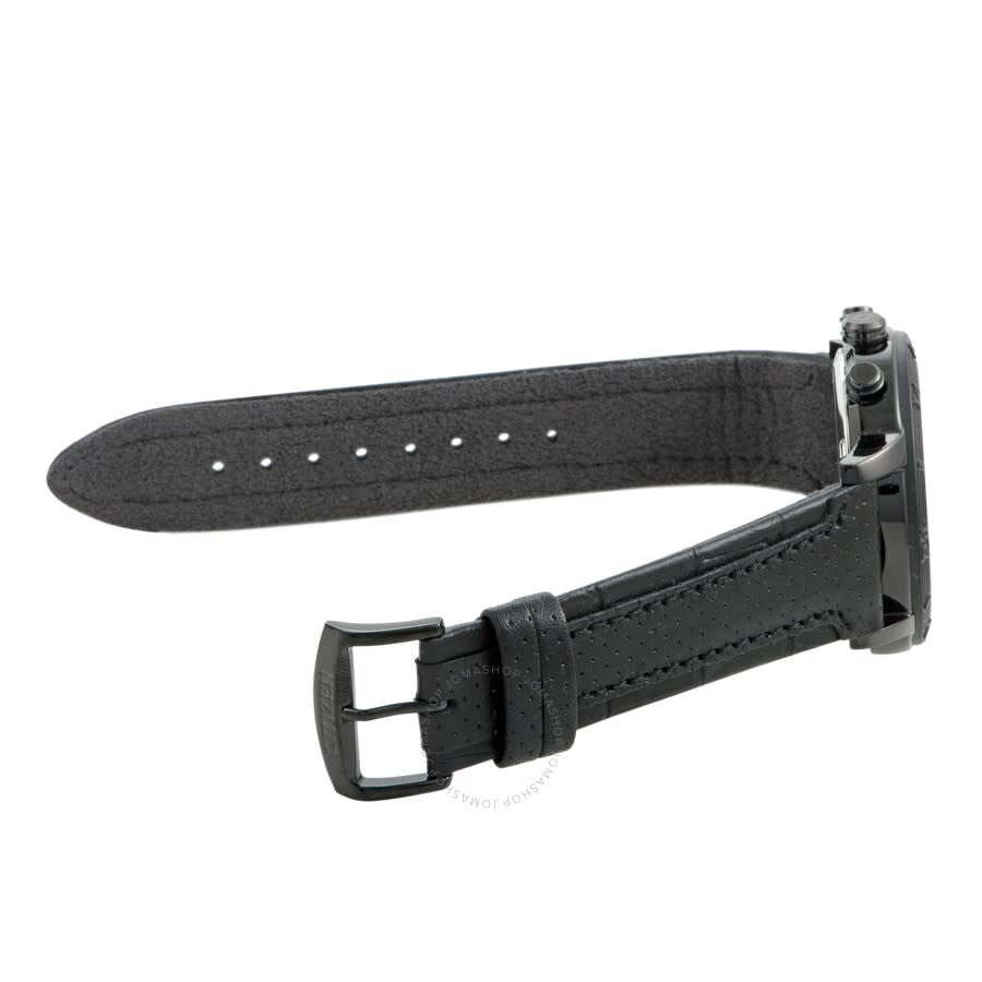 Black-plated stainless steel case with a black leather strap. Fixed black-plated bezel. Black dial with luminous black hands and Arabic numeral hour markers. Minute markers around the outer rim. Dial Type: Analog. Luminescent hands and markers. Date display at the 4 o'clock position. Chronograph - three sub-dials displaying: 60 second, 60 minute and 24 hour (GMT). Citizen caliber Eco-Drive H504 automatic movement. Scratch resistant mineral crystal. Solid case back. Round case shape. Case size: 46 mm. Case thickness: 12 mm. Band width: 19 mm. Tang clasp. Water resistant at 100 meters / 330 feet. Functions: chronograph, date, GMT, hour, minute, second, solar-powered. Wdr Series. Sport watch style. Watch label: Japan Movt. Citizen WDR Chronograph Automatic Black Dial Men's Watch AT2205-01E.