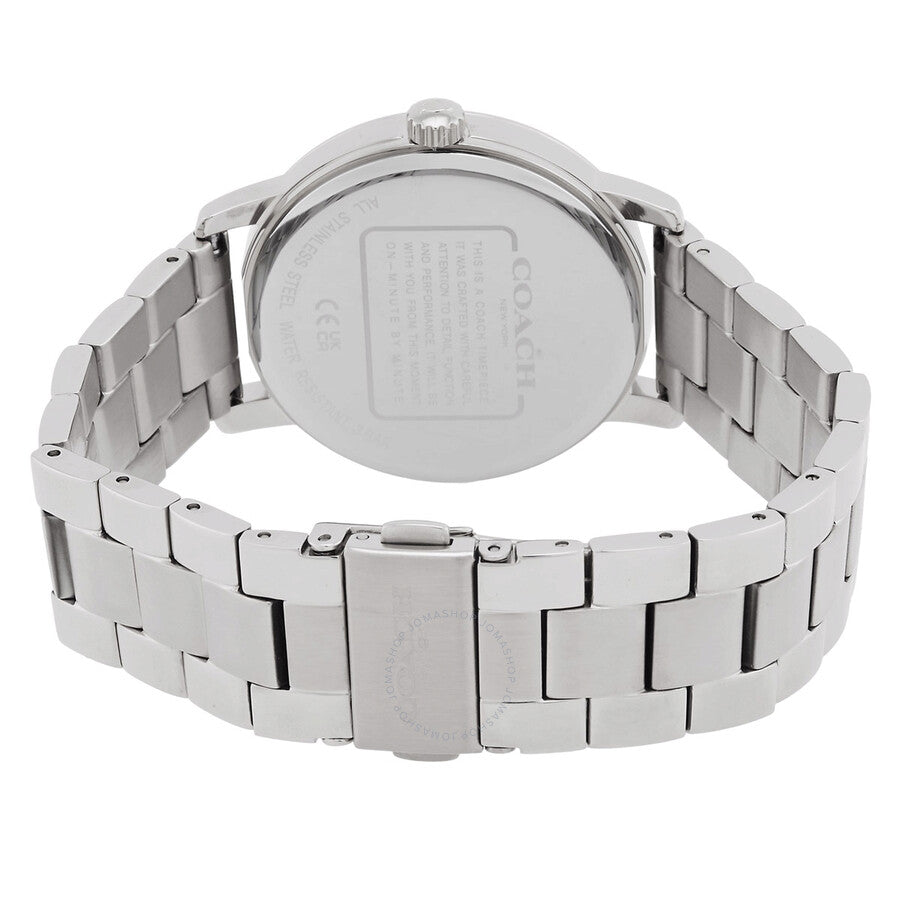 Silver-tone stainless steel case and bracelet. Fixed silver-tone stainless steel bezel. Pink dial with silver-tone hands and index hour markers. Dial Type: Analog. Quartz movement. Scratch resistant mineral crystal. Pull / push crown. Solid case back. Round case shape, case size: 36 mm. Fold over clasp with a safety release. Water resistant at 30 meters / 100 feet. Functions: hour, minute, second. Grand Series. Casual watch style. Coach Grand Quartz Pink Dial Watch Strap Gift Set 14000088.