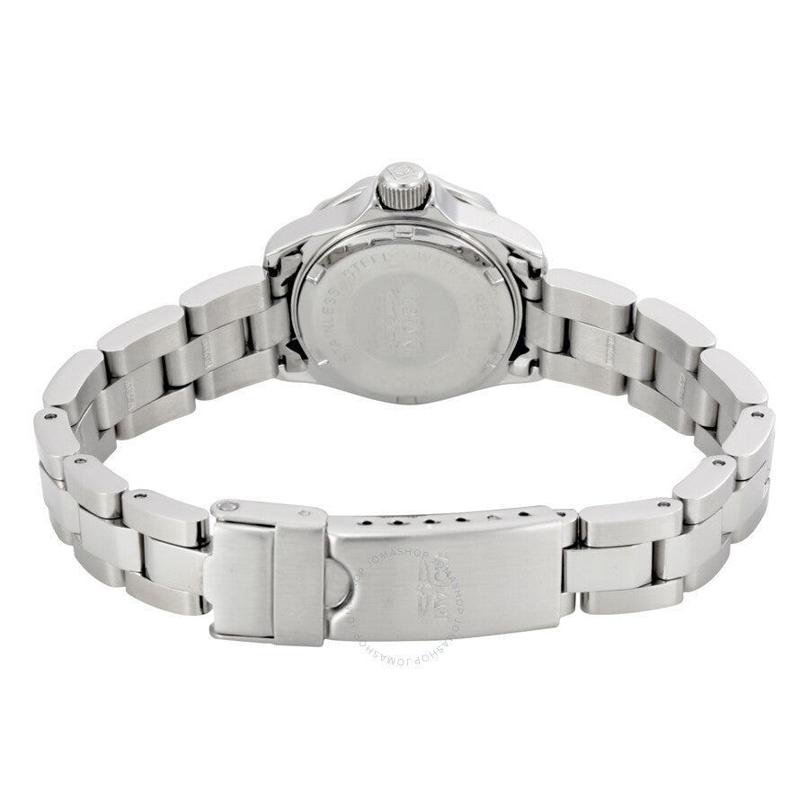 Stainless steel case with a stainless steel bracelet. Unidirectional stainless steel bezelwith an inlaid black ion-plated top ring. Black dial with luminous hands and dot hour markers. Minute markers around the outer rim. Dial Type: Analog. Luminescent hands and dial markers. Date display at the 3 o'clock position. Hattori caliber PC32A quartz movement. Scratch resistant anti-reflective flame fusion crystal crystal. Pull / push crown. Screw down stainless steel case back. Round case shape. Case size: 25 mm. Case thickness: 10 mm. Band width: 12 mm. Fold over clasp with a safety release. Water resistant at 100 meters / 330 feet. Functions: date, hour, minute, second. Sport watch style. Watch label: Japan Movt. Invicta Mako Pro Diver Black Dial Ladies Watch 8939.