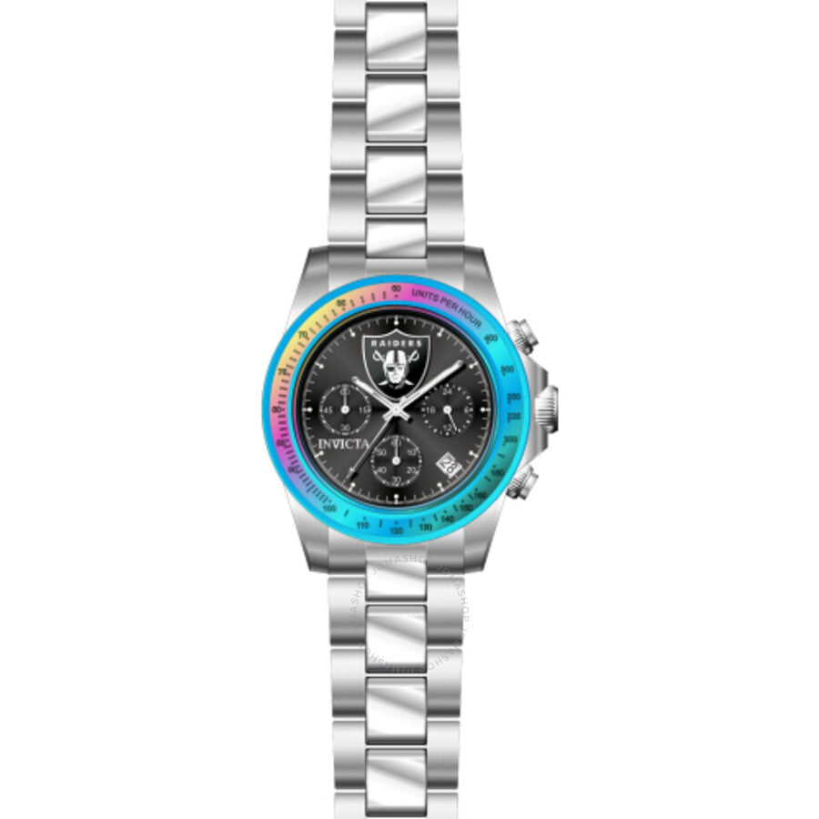 Silver-tone and iridescent stainless steel case with a silver-tone stainless steel bracelet. Stainless steel bezel. Black dial with silver-tone hands and index hour markers. Minute markers around the outer rim. Dial Type: Analog. Luminescent hands and markers. Date display between 4 and 5 o'clock position. Chronograph - three sub-dials displaying: 60 second, 60 minute and 24 hour. Hattori Caliber VD53 quartz movement. Scratch resistant mineral crystal. Pull / push crown. Solid case back. Round case shape, case size: 40 mm. Band width: 20 mm, band length: 8 inches. Fold over clasp. Water resistant at 200 meters / 660 feet. Functions: chronograph, date, GMT, second time zone, hour, minute, second. Nfl Series. Casual watch style. Watch label: Japan Movt. Invicta NFL Las Vegas Raiders Chronograph GMT Quartz Black Dial Men's Watch 44983.
