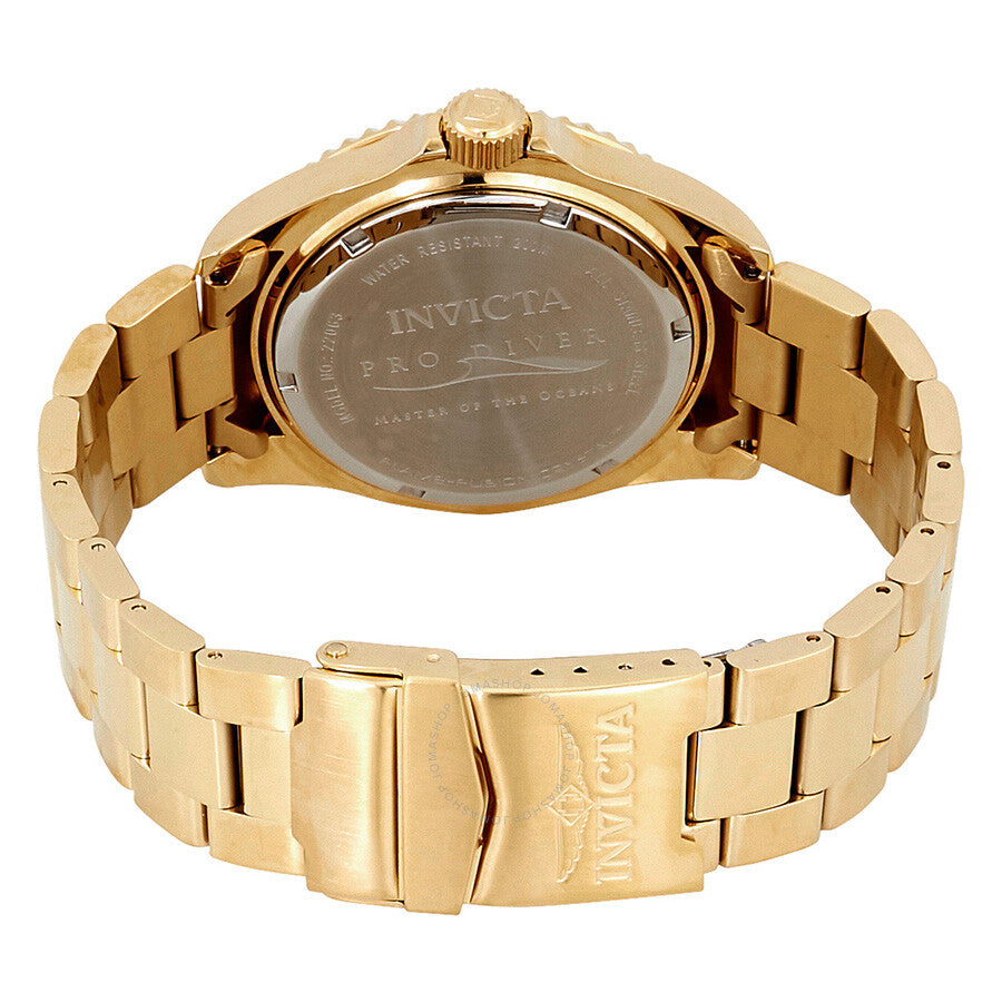 Yellow gold-plated stainless steel case and bracelet. Uni-directional rotating yellow gold-plated bezel with a inlaid blue top ring. Blue dial with luminous yellow gold-tone hands and dot hour markers. Minute markers around the outer rim. Dial Type: Analog. Luminescent hands and markers. Date display at the 3 o'clock position. Caliber: PC32A quartz movement. Scratch resistant flame fusion crystal. Screw down crown. Solid case back. Case size: 43 mm. Case thickness: 12 mm. Round case shape. Band width: 22 mm. Band length: 8.25 inches. Fold over clasp with a safety release. Water resistant at 200 meters / 660 feet. Functions: date, hour, minute, second. Casual watch style. Invicta Pro Diver Blue Dial Men's Watch 22063.