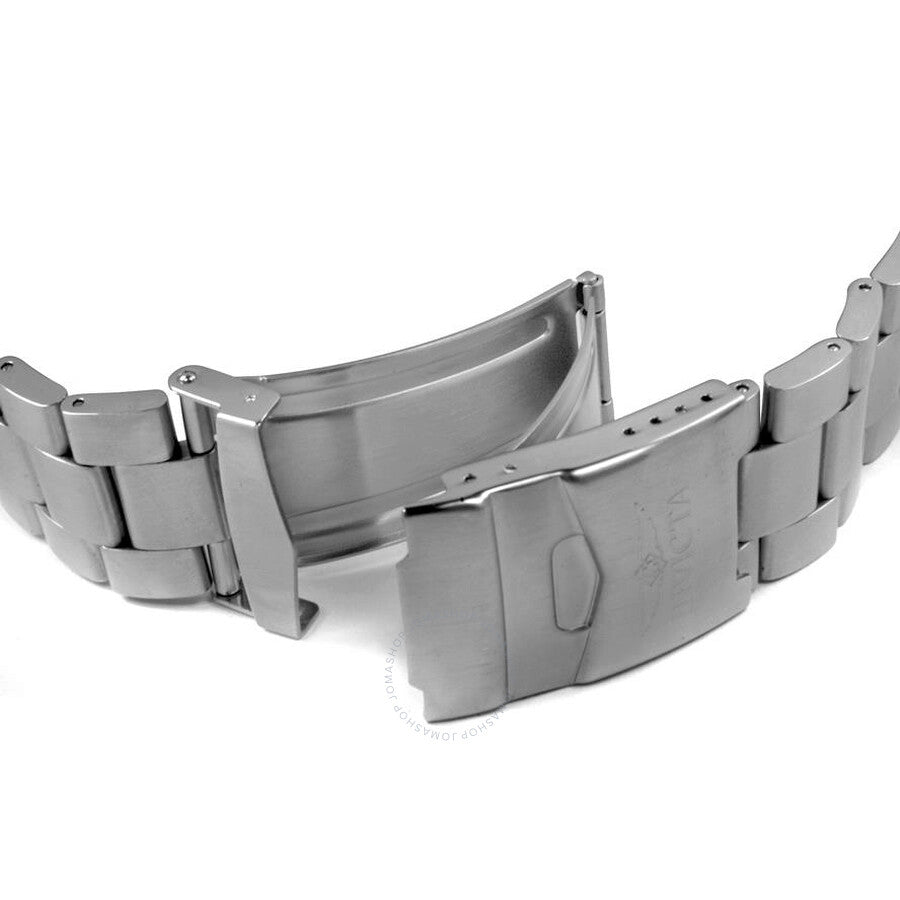 Stainless steel case with a stainless steel bracelet. Fixed stainless steel bezel with an inlaid black ring showing tachymeter markings. Black dial with luminous silver-tone hands and index hour markers. Minute markers around the outer rim. Dial Type: Analog. Luminescent hands and markers. Date display at the 3 o'clock position. Day of the week display centered on the 10 o'clock position. Hattory Caliber VX44E quartz movement. Scratch resistant mineral crystal. Pull / push crown. Solid case back. Round case shape. Case size: 45 mm. Case thickness: 10 mm. Band width: 24 mm. Band length: 9 inches. Fold over clasp with a safety release. Water resistant at 50 meters / 165 feet. Functions: date, day, hour, minute, second, tachymeter. Specialty Series. Sport watch style. Watch label: Japan Movt. Invicta Specialty Black Dial Men's Watch 5781.