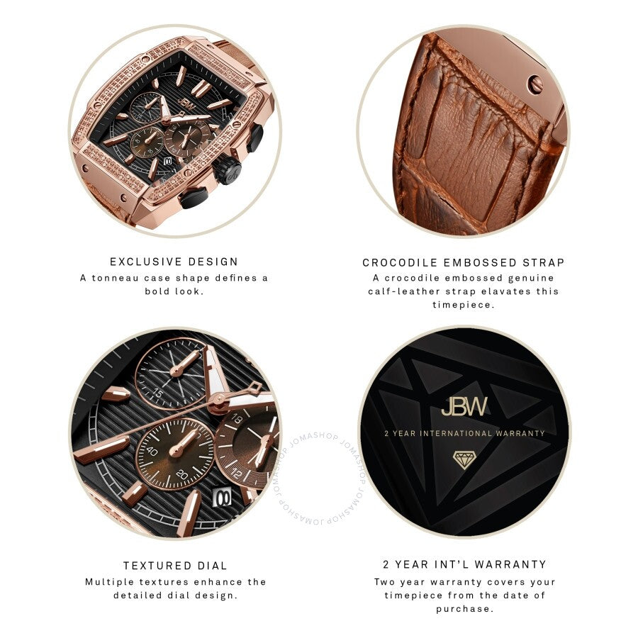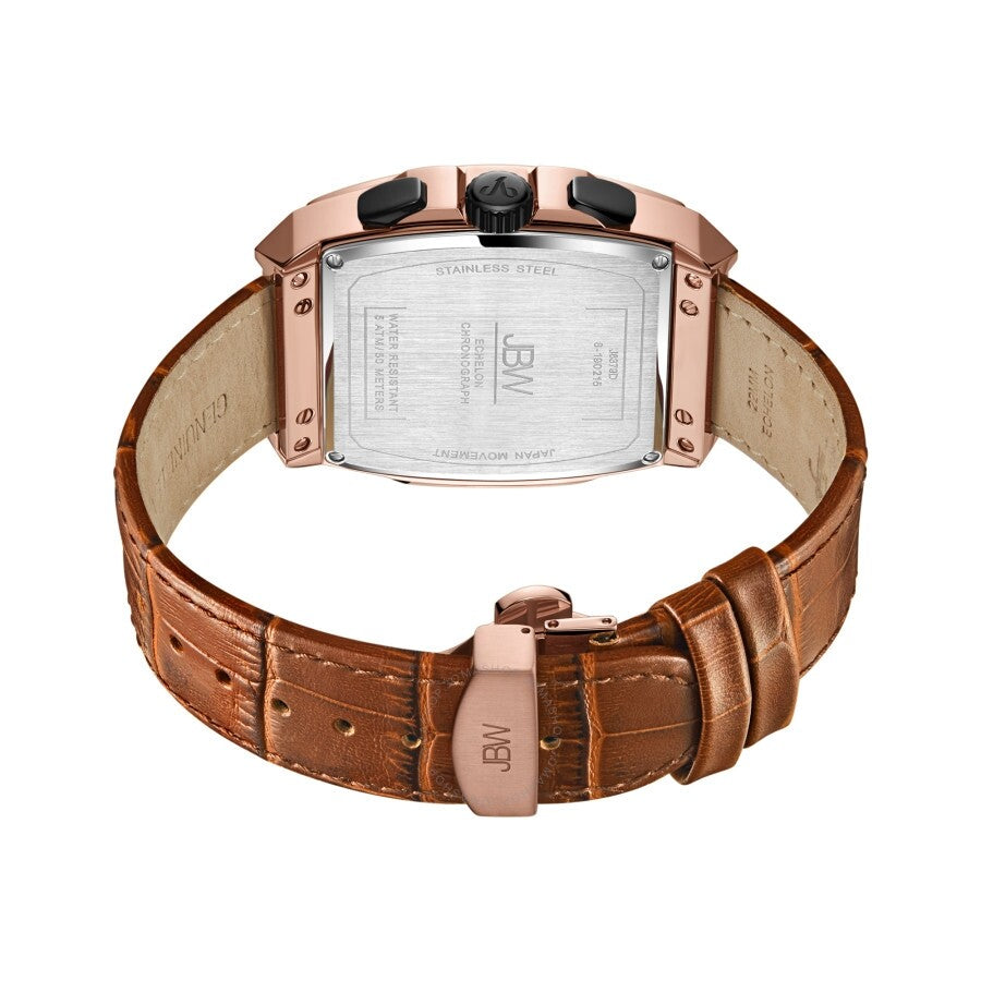 Rose gold-tone stainless steel case with a brown leather strap. Fixed 18kt rose gold-plated bezel set with diamonds. Grey dial with luminous rose gold-tone hands and index hour markers. Minute markers around the outer rim. Dial Type: Analog. Luminescent hands and markers. Date display between the 4 and 5 o'clock positions. Chronograph - three sub-dials displaying: 60 second, 30 minute and 24 hour. Quartz movement. Scratch resistant mineral crystal. Pull / push crown. Solid case back. Tonneau case shape. Case size: 41 mm. Case thickness: 12 mm. Band width: 22 mm. Band length: 8.5 inches. Deployment clasp with a push button release. Water resistant at 50 meters / 165 feet. Functions: chronograph, date, hour, minute, second, 24 hour. Additional Info: 28 diamonds. Echelon Series. Luxury watch style. Watch label: Japan Movt. JBW Echelon Chronograph Quartz Diamond Grey Dial Men's Watch J6379D.