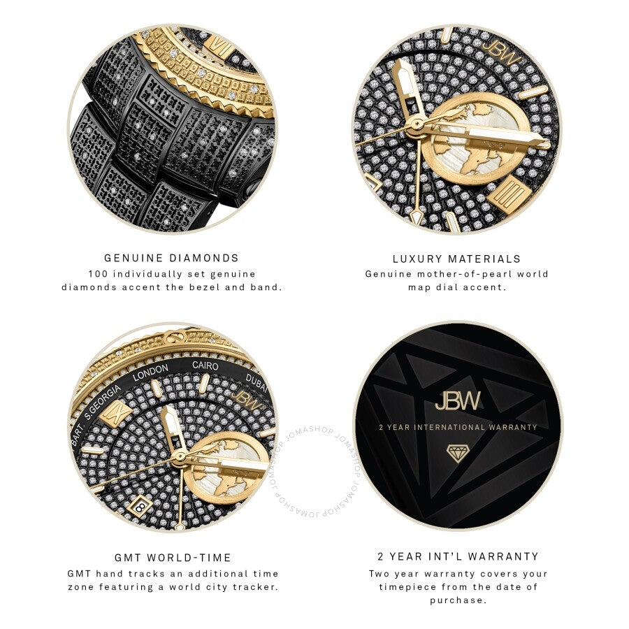 Black-plated stainless steel case and bracelet set with crystals. Fixed gold-tone bezel set with crystals. Black (crystal pave) dial with luminous gold-tone hands and index hour markers. Roman numerals appear at the 3, 6, and 9 o'clock positions. World time cities. Dial Type: Analog. Luminescent hands and markers. Date display above the 6 o'clock position. Ronda caliber 505.24H quartz movement. Scratch resistant mineral crystal. Pull / push crown. Solid case back. Round case shape. Case size: 46 mm. Case thickness: 13 mm. Band width: 24 mm. Band length: 8.5 inches. Fold over clasp with a safety release. Water resistant at 50 meters / 165 feet. Functions: day, GMT, second time zone, hour, minute, second. Additional Info: 100 genuine diamonds. Jet Setter GMT Series. Dress watch style. Watch label: Swiss Movt. JBW Jet Setter GMT Quartz Black Dial Men's Watch J6370C.
