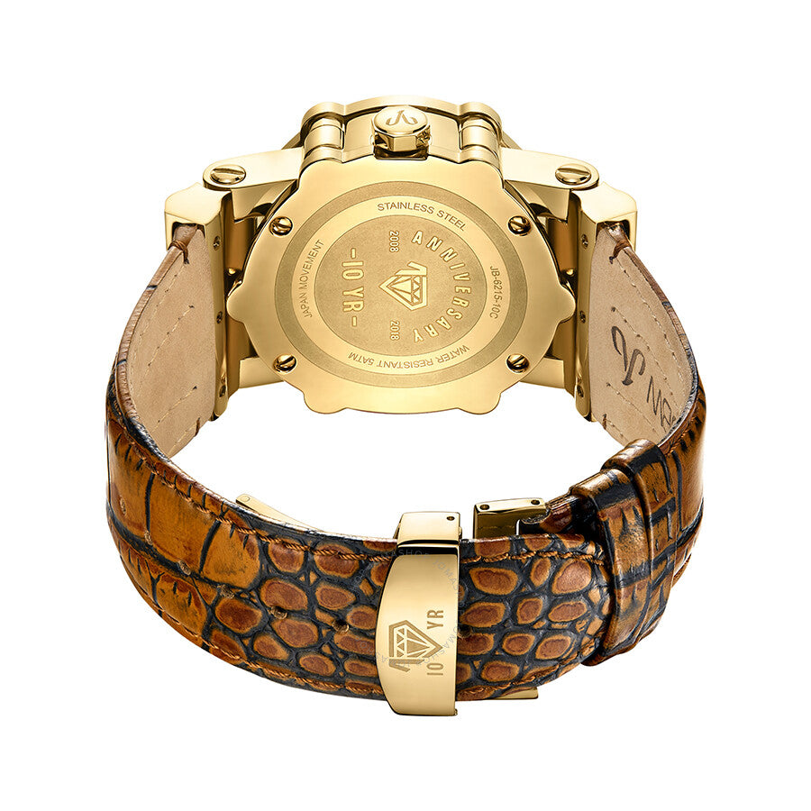 Gold-tone stainless steel case with a brown leather strap. Silver gold-tone bezel set with diamonds. Gold diamond-set dial with luminous gold-tone hands and Arabic numeral hour markers. Minute markers around the outer rim. Dial Type: Analog. Luminescent hands. Date display between 4 and 5 o'clock position. Chronograph - three grey sub-dials displaying: 60 second, 60 minute and 24 hour. Hattori caliber VD53 quartz movement. Scratch resistant mineral crystal. Solid case back. Round case shape. Case size: 42 mm. Case thickness: 14 mm. Band width: 30 mm. Band length: 8.5 inches. Butterfly clasp. Water resistant at 50 meters / 165 feet. Functions: chronograph, date, GMT, second time zone, hour, minute, second. Additional Info: 196 diamonds - 1.96 ctw. Dress watch style. Watch label: Japan Movt. JBW Men's 10 YR Anniversary Phantom 1.96 ctw Diamond Chronograph Watch JB-6215-10C.