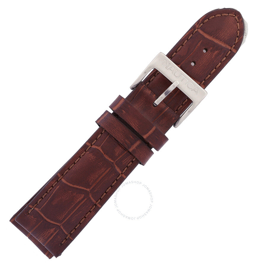 Silver-tone stainless steel case with a brown leather strap. Fixed tachymeter scale silver-tone stainless steel bezel. Silver dial with rose gold-tone hands and index hour markers. Minute markers around the outer rim. Dial Type: Analog. Luminescent hands and markers. Date display between 4 and 5 o'clock position. Chronograph - three sub-dials displaying: 60 second, 60 minute and 24 hour. Quartz movement. Scratch resistant mineral crystal. Solid case back. Round case shape, case size: 44 mm. Water resistant at 100 meters / 330 feet. Functions: chronograph, date, hour, minute, second. Spettacolare Series. Sport watch style. Nautica Spettacolare Chronograph Quartz Silver Dial Men's Watch NAPSPF204.