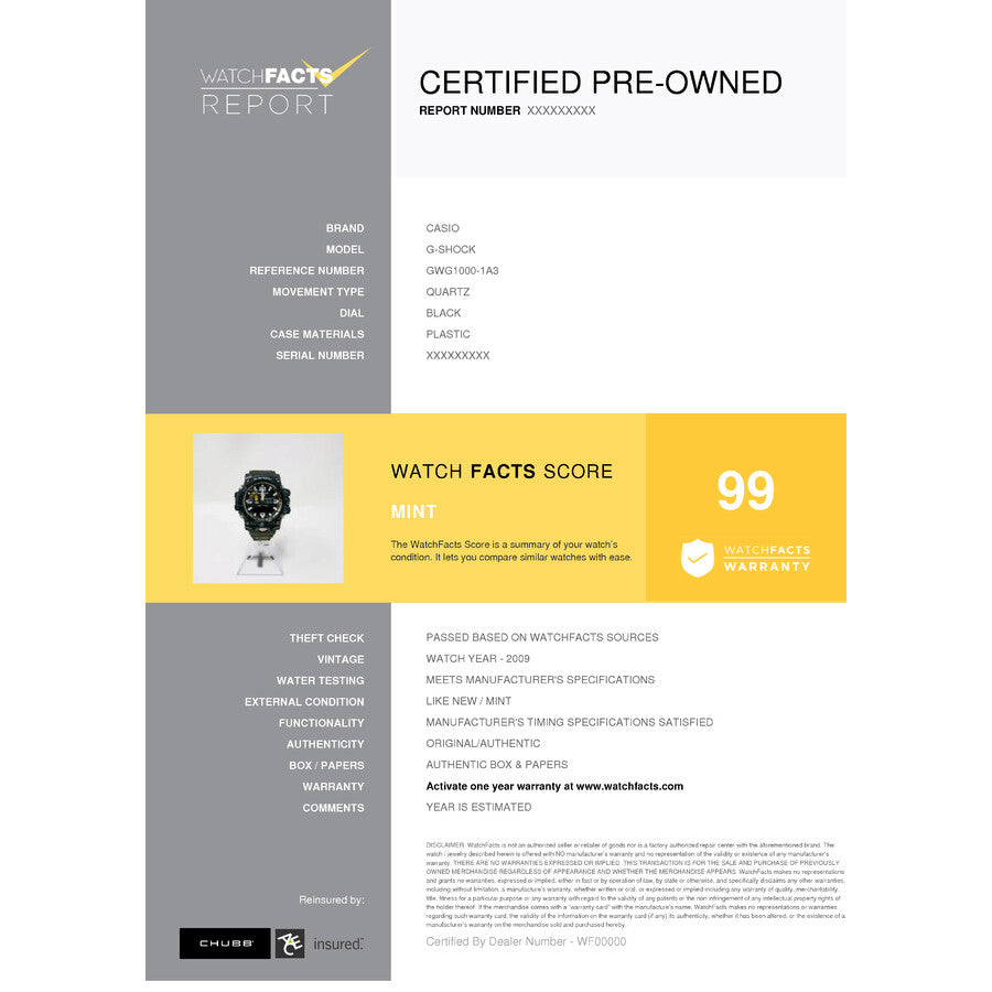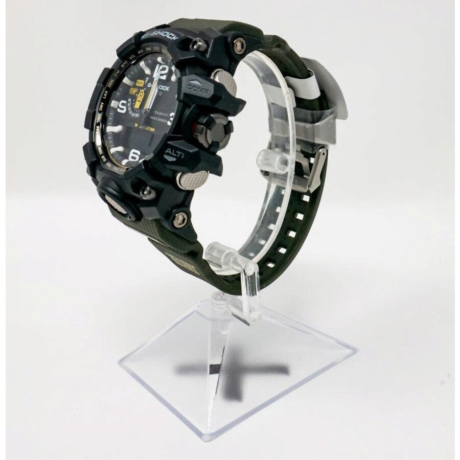 Black stainless steel case with a dark green rubber strap. Black bezel. Black dial with Arabic numeral and index hour markers. Dial Type: Analog. Luminescent hands and markers. Perpetual calendar. Casio Calibre 5463 quartz movement. Scratch resistant sapphire crystal. Solid case back. Round case shape, case size: 56 mm, case thickness: 18 mm. Deployment clasp. Water resistant at 200 meters / 660 feet. Functions: perpetual calendar, atomic timekeeping, radio controlled, chronograph, flyback, world time, alarm, date, day, GMT, second time zone, hour, minute, second, thermometer, altitude indicator, barometer, compass, solar-powered, shock resistant. Sport watch style. Watch label: Japan Movt. Pre-owned Casio G-Shock Mudmaster Perpetual Alarm World Time Chronograph Black Dial Men's Watch GWG1000-1A3.
