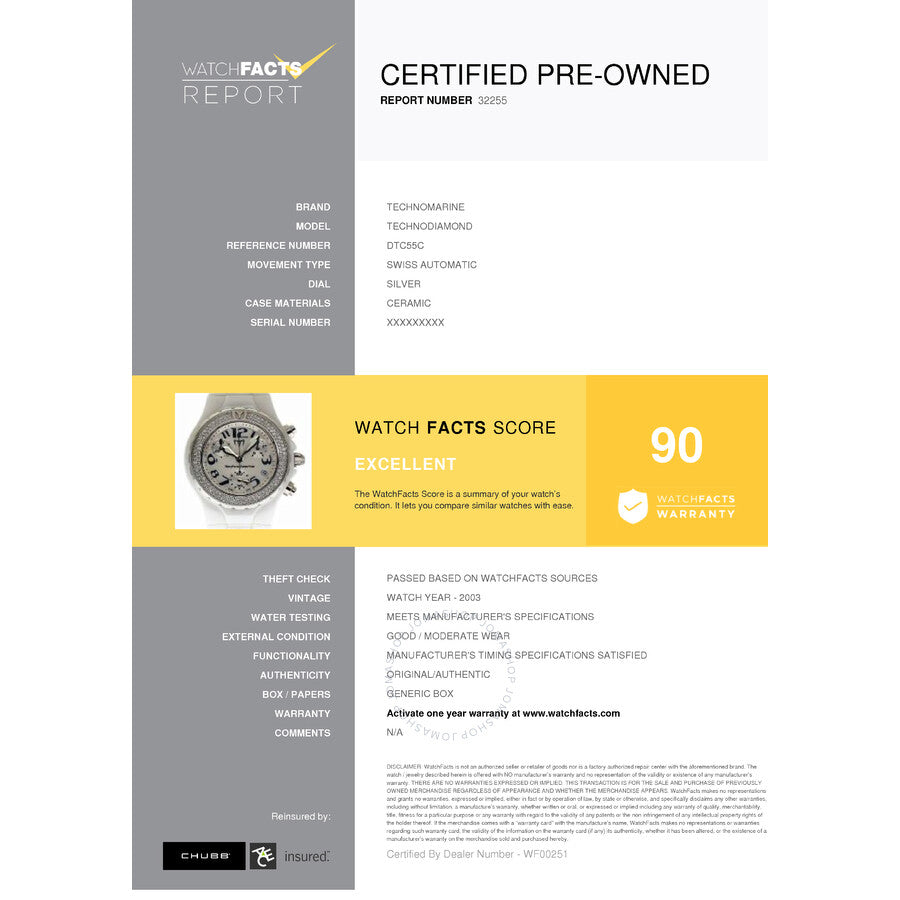 White ceramic case with a white ceramic bracelet. Uni-directional rotating silver-tone 106 diamond set bezel. Silver-tone dial with silver-tone hands and Arabic numeral hour markers. Minute markers around the outer rim. Dial Type: Analog. Luminescent hands. Date display at the 4 o'clock position. Chronograph - three sub-dials displaying: 60 second, 30 minute and 1/10th of a second. ETA Caliber G10.711 quartz movement. Scratch resistant sapphire crystal. Screw down crown. Solid case back. Round case shape. Case size: 40 mm. Band length: 7.25 inches. Deployment clasp. Water resistant at 200 meters / 660 feet. Functions: chronograph, rattrapante, date, hour, minute, small second. Dress watch style. Watch label: Swiss Made. Pre-owned Technomarine Technodiamond Chronograph Silver Dial Ladies Watch DTC55C.