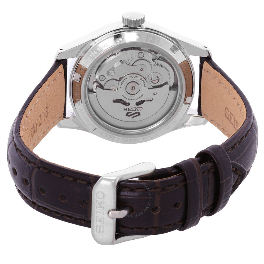 Silver-tone stainless steel case with a brown leather strap. Fixed silver-tone stainless steel bezel. Green dial with silver-tone hands and Arabic numeral hour markers. Minute markers around the outer rim. Dial Type: Analog. Luminescent hands and markers. Day of the week and date display at the 3 o'clock position. Seiko Caliber 4R36 Automatic movement, containing 24 Jewels, bitting at 21600 vph, and has a power reserve of approximately 41 hours. Scratch resistant curved Hardlex crystal. Transparent case back. Round case shape, case size: 36.4 mm, case thickness: 12.5 mm. Band width: 18 mm. Tang clasp. Water resistant at 100 meters / 330 feet. Functions: date, day, hour, minute, second. 5 Sports Series. Sport watch style. Watch label: Japan Movt. Seiko 5 Sports Automatic Green Dial Men's Watch SRPJ89K1.