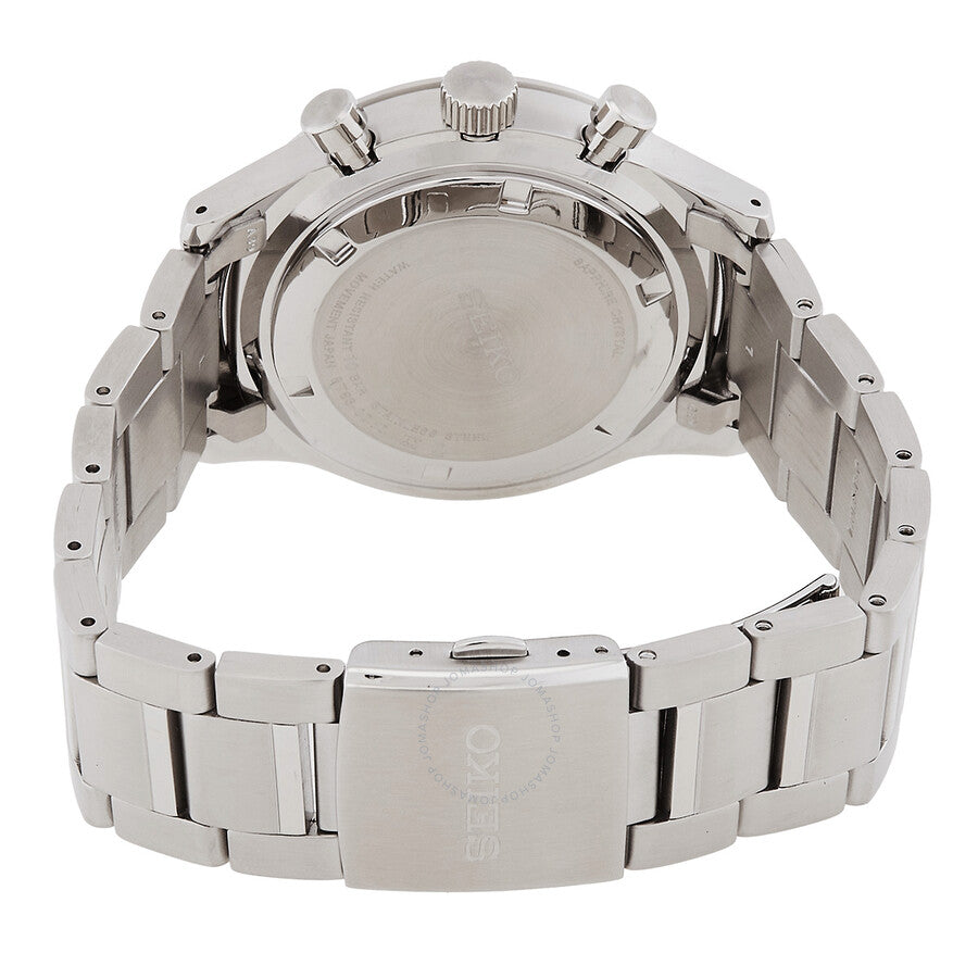 Silver-tone stainless steel case and bracelet. Fixed silver-tone stainless steel bezel. Black dial with silver-tone hands and index hour markers. Minute markers around the outer rim. Dial Type: Analog. Luminescent hands and markers. Date display between 4 and 5 o'clock position. Chronograph - three sub-dials displaying: 60 minute, 60 second, 24 hour. Seiko Caliber 8T63 quartz movement. Scratch resistant sapphire crystal. Solid case back. Round case shape, case size: 43 mm, case thickness: 11.6 mm. Band width: 22 mm. Fold over clasp with a safety release. Water resistant at 100 meters / 330 feet. Functions: chronograph, date, GMT, second time zone, hour, minute, second. Sport watch style. Watch label: Japan Movt. Seiko Chronograph Quartz Black Dial Men's Watch SSB413P1.