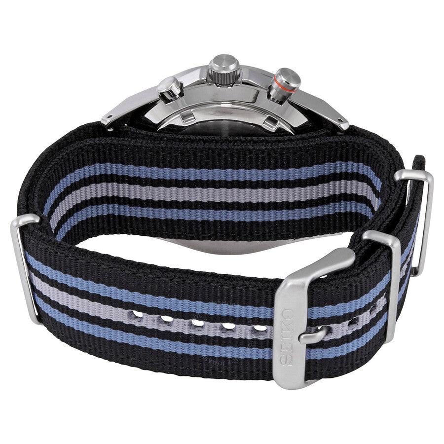 Stainless steel case with a striped black and blue nylon strap. Fixed stainless steel bezel. Blue dial with luminous silver-tone hands and index hour markers. Minute markers. Tachymeter markings around the outer rim. Dial Type: Analog. Luminescent hands and markers. Date display between the 4 and 5 o'clock positions. Chronograph - three sub-dials displaying: 60 minute, 60 second, 24 hour. Seiko caliber 8T63 quartz movement. Scratch resistant mineral crystal. Solid case back. Round case shape. Case size: 41 mm. Case thickness: 12 mm. Band width: 22 mm. Tang clasp. Water resistant at 100 meters / 330 feet. Functions: chronograph, date, GMT, second time zone, hour, minute, second. Sport watch style. Watch label: Japan Movt. Seiko Chronograph Quartz Blue Dial Men's Watch SSB409P1.