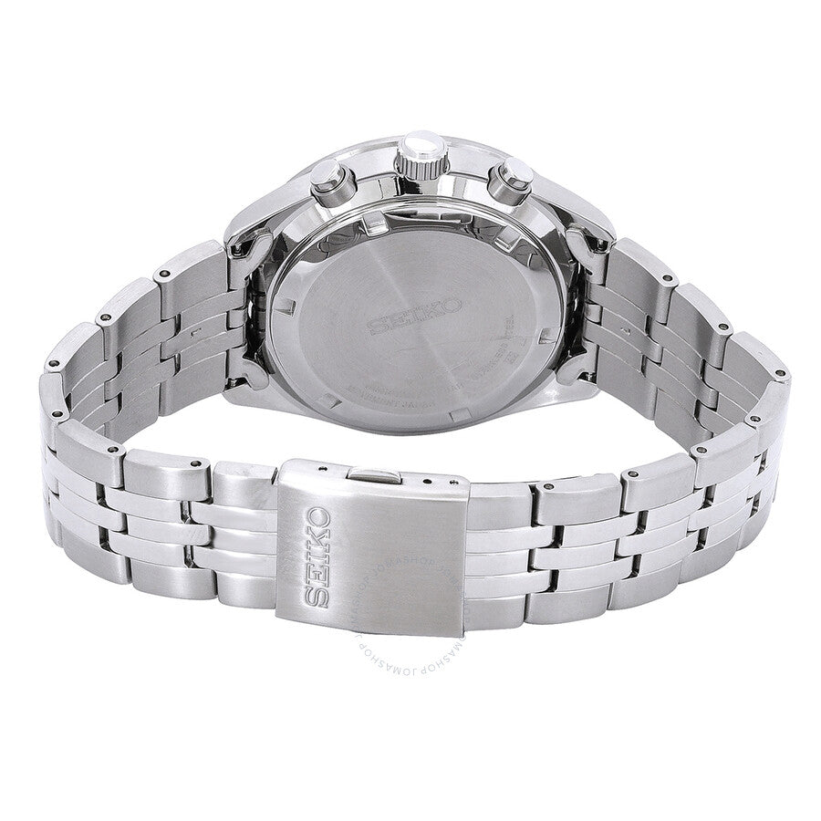 Silver-tone stainless steel case and bracelet. Fixed silver-tone stainless steel bezel. Blue dial with silver-tone hands and index hour markers. Minute markers around the outer rim. Dial Type: Analog. Date display between 4 and 5 o'clock position. Chronograph - three sub-dials displaying: 60 minute, 60 second, 24 hour. Seiko Caliber 8T63 quartz movement. Scratch resistant Hardlex crystal. Solid case back. Round case shape, case size: 41.5 mm, case thickness: 12.1 mm. Band width: 22 mm. Fold over clasp with a safety release. Water resistant at 100 meters / 330 feet. Functions: chronograph, date, hour, minute, second. Sport watch style. Watch label: Japan Movt. Seiko Chronograph Quartz Blue Dial Men's Watch SSB427P1.