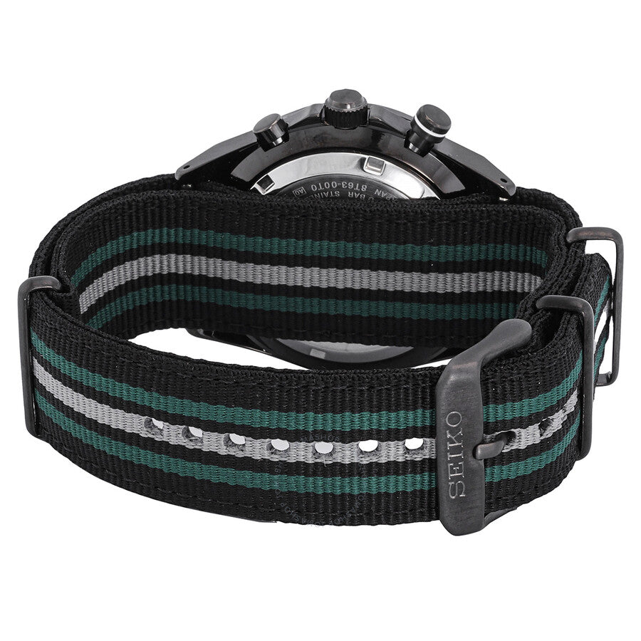 Black-coated stainless steel case with a stripe black and blue nylon NATO band. Fixed black-coated bezel. Green dial with luminous silver-tone hands and index hour markers. Minute markers. Tachymeter markings around the outer rim. Dial Type: Analog. Luminescent hands and markers. Date display between the 4 and 5 o'clock positions. Chronograph - three sub-dials displaying: 60 second, 60 minute and 24 hour. Seiko caliber 8T63 quartz movement. Scratch resistant Hardlex crystal. Pull / push crown. Solid case back. Round case shape. Case size: 41 mm. Case thickness: 12 mm. Band width: 22 mm. Tang clasp. Water resistant at 100 meters / 330 feet. Functions: chronograph, tachymeter,date, GMT, second time zone, hour, minute, second. Sport watch style. Watch label: Japan Movt. Seiko Chronograph Quartz Green Dial Men's Watch SSB411P1.
