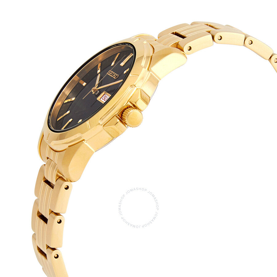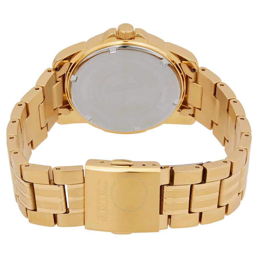 Yellow gold-tone stainless steel case and bracelet. Fixed yellow gold-tone bezel. Black dial with luminous yellow gold-tone hands and index hour markers. Minute markers around the outer rim. Dial Type: Analog. Luminescent hands and markers. Day of the week and date display at the 3 o'clock position. Quartz movement. Scratch resistant sapphire crystal. Pull / push crown. Solid case back. Round case shape. Case size: 39 mm. Case thickness: 11 mm. Band width: 20 mm. Fold over clasp with a push button release. Water resistant at 100 meters / 330 feet. Functions: date, day, hour, minute, second. Essentials Series. Casual watch style. Watch label: Japan Movt. Seiko Essentials Quartz Black Dial Men's Watch SUR358.