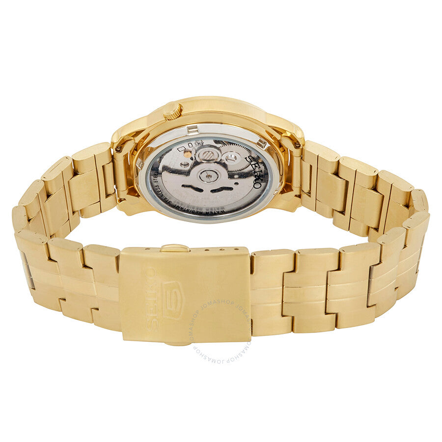 Yellow gold-plated stainless steel case and bracelet. Fixed yellow gold-plated bezel. Black dial with luminous yellow gold-tone hands and index hour markers. Minute markers around the outer rim. Dial Type: Analog. Luminescent hands and markers. Day of the week and date display at the 3 o'clock position. Seiko caliber 7S26 automatic movement with a 40-hour power reserve. Scratch resistant hardlex crystal. Pull / push crown. Transparent case back. Round case shape. Case size: 37 mm. Case thickness: 11 mm. Band width: 18 mm. Fold over clasp with a safety release. Water resistant at 30 meters / 100 feet. Functions: date, day, hour, minute, second. Casual watch style. Seiko Series 5 Automatic Black Dial Men's Watch SNKL88.